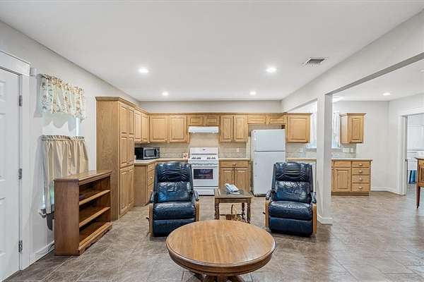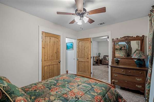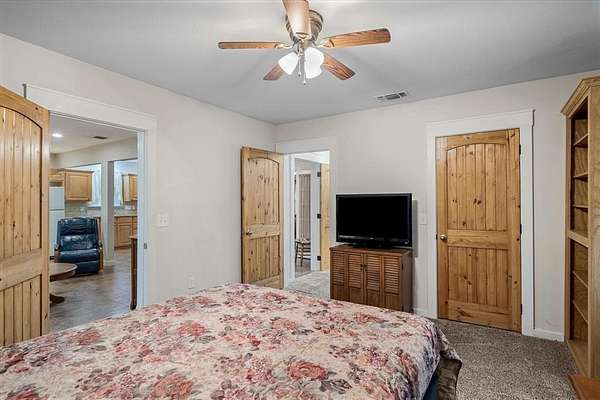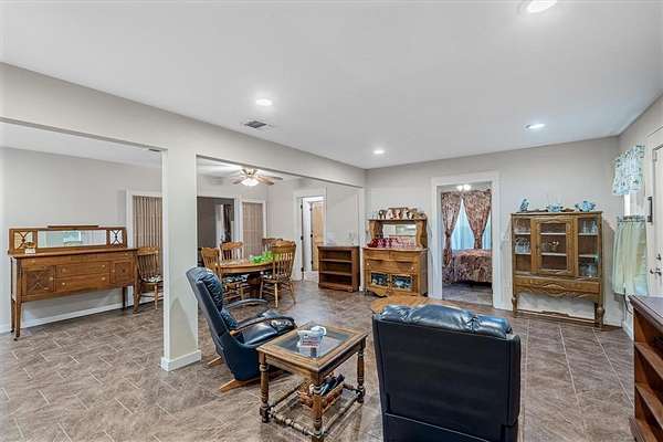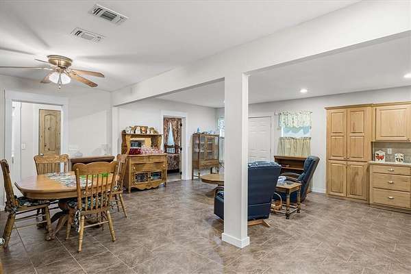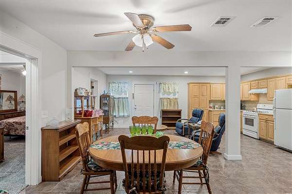 Inside, the open floor plan flows easily between spaces, with a cozy living area, dining room, and a den just off the kitchen. Antique French doors add charm while creating separation between the living room and the kitchen and den. The spacious bathroom features a walk-in shower, and the full-size utility room includes a sink and two storage closets, one being a cedar closet.