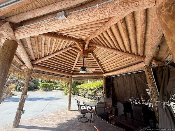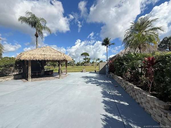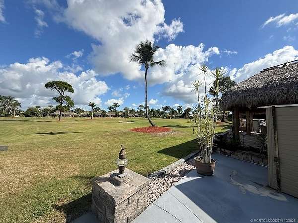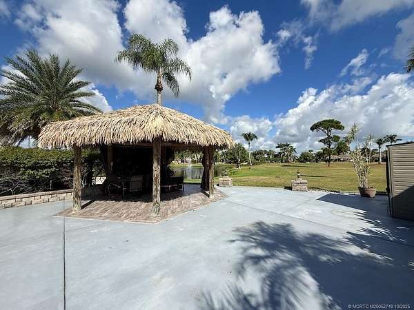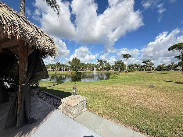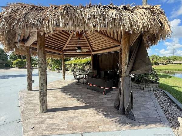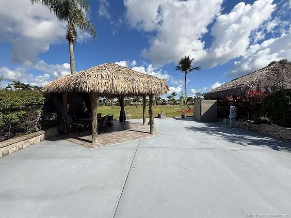 Prime Lakefront Lot on "Millionaire's Row" - Fully Furnished! Location, location! Situated along the prestigious "Millionaire's Row" in Motorcoach Resort St. Lucie West, this spacious 3,025 sq. ft. lot offers stunning views of the lake with its lighted fountains and the rolling hills of the golf course beyond. The expansive tiki hut features durable all-weather synthetic fronds and a tiled floor for carefree, low-maintenance outdoor living-no re-thatching or roof spraying required! Enjoy complete privacy on both sides with raised landscape beds and mature tropical plantings. Sold fully furnished with a sofa, two chairs, coffee table, and dining set, this property is move-in ready and perfectly designed for relaxing or entertaining in style. A rare opportunity in one of the resort's most coveted locations!