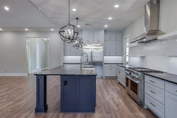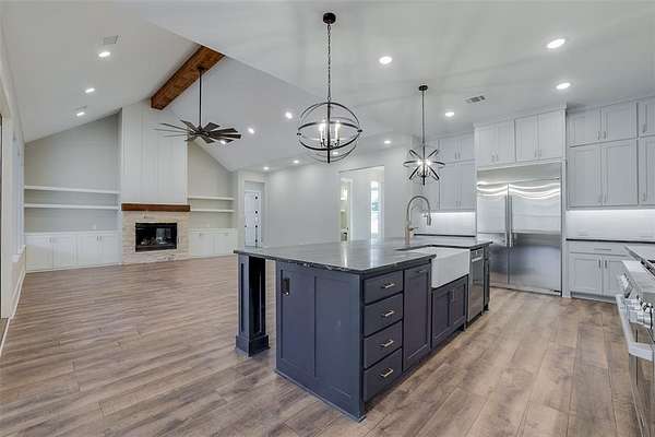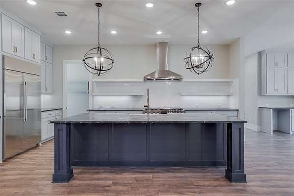 At the heart of the home, the chef's kitchen serves as a stunning focal point, complete with high-end appliances, custom cabinetry, abundant counter space, a statement farmhouse sink, oversized island with sink and breakfast bar, and a dedicated coffee bar--perfect for gathering in style. The second level provides a private guest suite with a full bath and an oversized bonus room ideal for a media lounge, game room, or additional living space.
