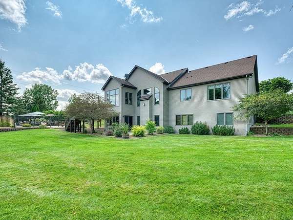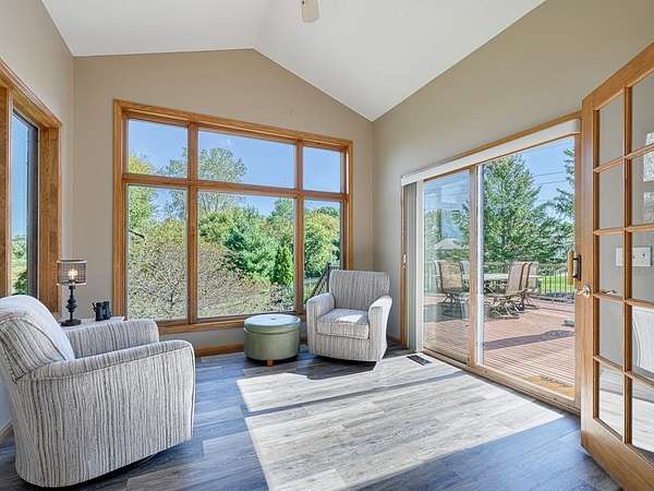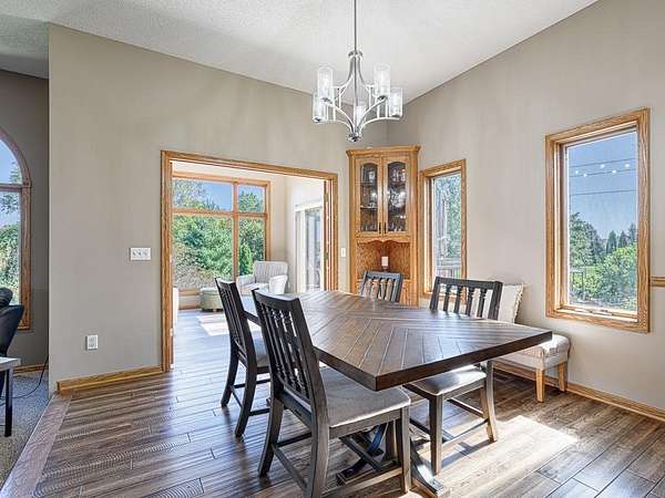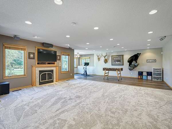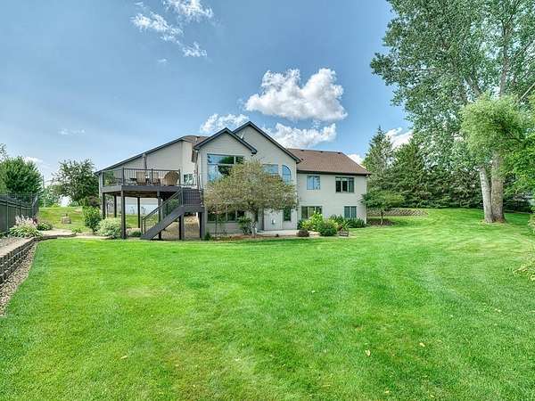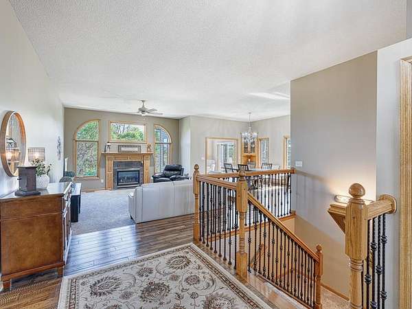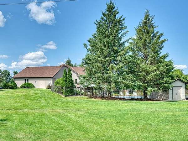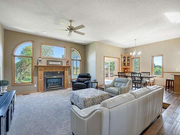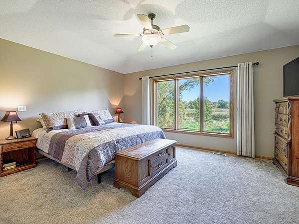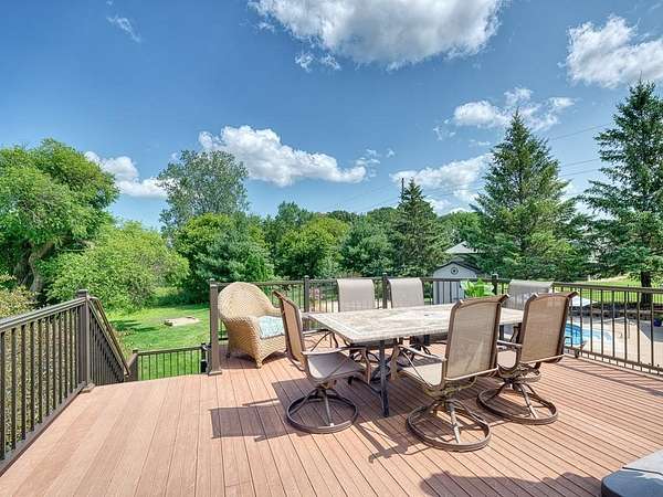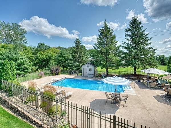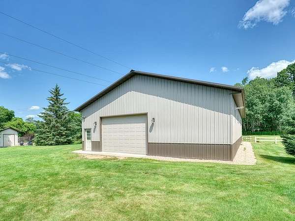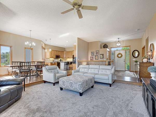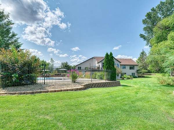 Discover an exceptional opportunity to own a spacious rambler nestled on a generous 10+ acre lot, offering the perfect blend of natural beauty and modern conveniences while being so close to town. This stunning property, situated in a peaceful cul-de-sac, boasts breathtaking views of the surrounding landscape, including a picturesque pond that adds to the serene atmosphere. The expansive lot backs up to Kelsey Round Park, the property offers an extended natural playground right at your doorstep. The home features an open floor plan with 4 bedrooms plus a den, providing flexible living space for various needs. The kitchen boasts a corner sink with a window view, center island, elegant Cambria countertops, stainless steel appliances, and a large pantry cupboard with convenient pull-out shelves. Beautiful HDWD floors flow throughout the main living areas. The sunken living room is a focal point, featuring a cozy gas fireplace and an impressive wall of windows that flood the space with natural light. With 3 full bathrooms, comfort and convenience are assured for the entire family. The primary bedroom is a true retreat, featuring spectacular views, a new window, an elegant tray ceiling, and a large walk-in closet. Its ensuite bathroom offers luxury with a separate jacuzzi tub and shower, as well as dual sinks. An inviting sunroom just off the dining room allows you to enjoy the surrounding fantastic views year-round. While a large 21x18, maintenance-free deck provides the perfect space for outdoor entertaining and relaxation, overlooking the beautiful in-ground pool area and breathtaking views of the back property. The pool has a brand new liner with attractive fencing and landscaping around the pool area. Just think of all the entertaining you will do! The lower level offers a spacious family room, gas fireplace, tons of built-ins and walks out to a very private 15x18 patio area. A spacious 4-car garage with new epoxy floors. PLUS a heated 42x66 pole building ensures ample storage, a possible workshop or a place for all the toys. Close to walking/biking trails at Kelsey Round Lake Park and The Anoka Nature Preserve.