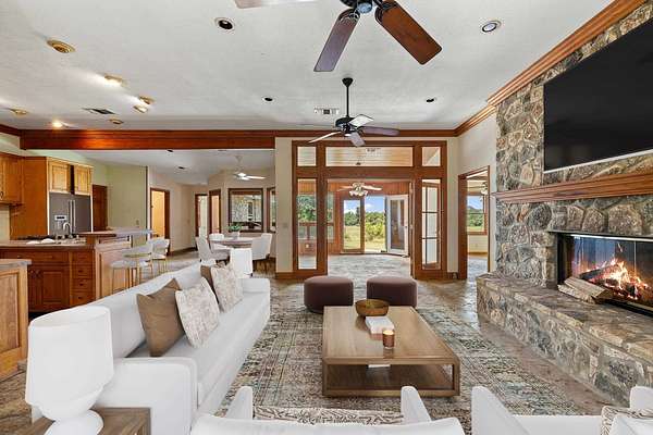 Nestled on approximately 10 acres in the highly sought-after Blanco area, this one-of-a-kind property was once home to the late, renowned American actress and film producer Shelley Duvall, best known for her roles in Popeye, The Shining, and many other 1970s classics. The residence offers 3 bedrooms, 2 baths, a sunroom, and a dedicated office space. The open-concept kitchen flows into a spacious living area anchored by a striking rock fireplace. Additional features include a 2-car garage, perimeter fencing, and multiple outbuildingsamong them a 20x35 metal building and a 40x50 workshop. While the home is in need of repairs and remodeling, it presents an incredible opportunity to restore and customize a piece of both Texas and Hollywood history. Perfectly situated just an hour from San Antonio and Austin, and only minutes from downtown Blanco, this property combines privacy, history, and convenience.