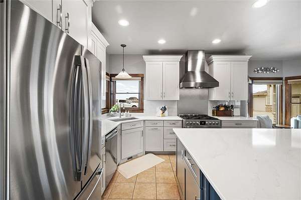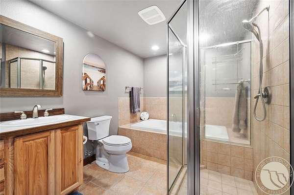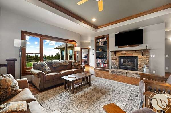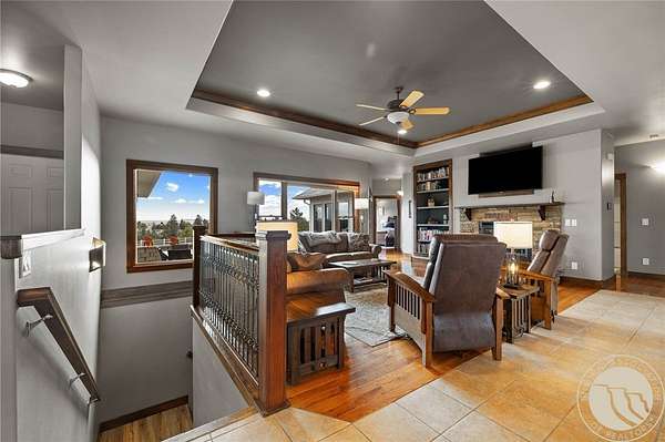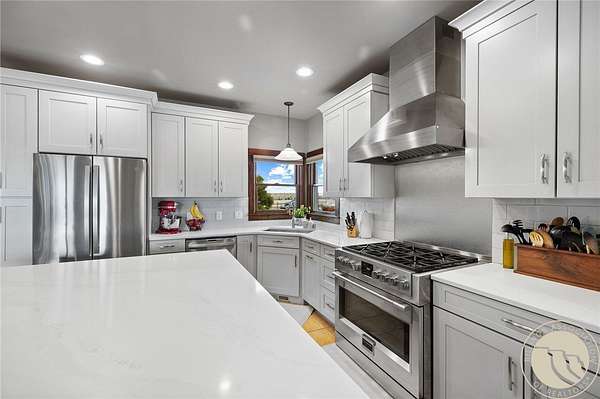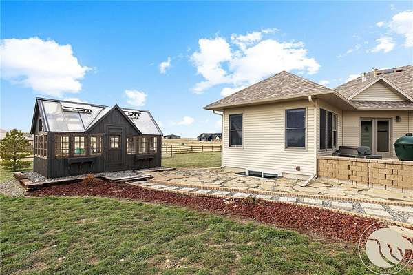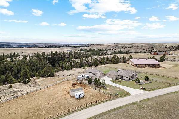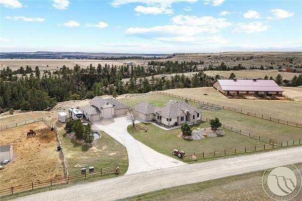 Comfort, luxury, space. Enjoy beautiful views & open skies over a timbered canyon in this Montana country home with over five acres. The interior features a stunning new kitchen from Hanneson Homes with an huge island, coffee bar, quartz tops, soft close cabinets, all new appliances with six burner gas stove, an open-dining living space with tile and wood floors and a gas fireplace, a main level owners' suite with a tile shower and dual sinks, main level laundry and a private patio. In the lower level you'll find a second family room with a gas fireplace and new flooring, a kitchenette, a large bedroom & additional bathroom, fitness/multipurpose room, & office/workspace. Tons of parking! Attached three car garage plus a giant triple bay shop with RV door & loft storage. (Floor is prepped for radiant heat.) More parking, a pond, & a greenhouse! In a gated community outside of Billings!
