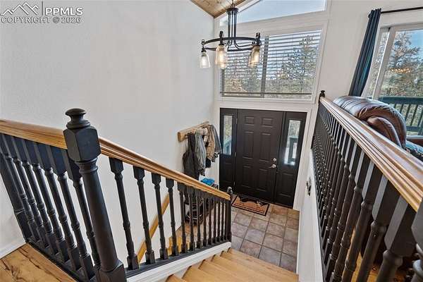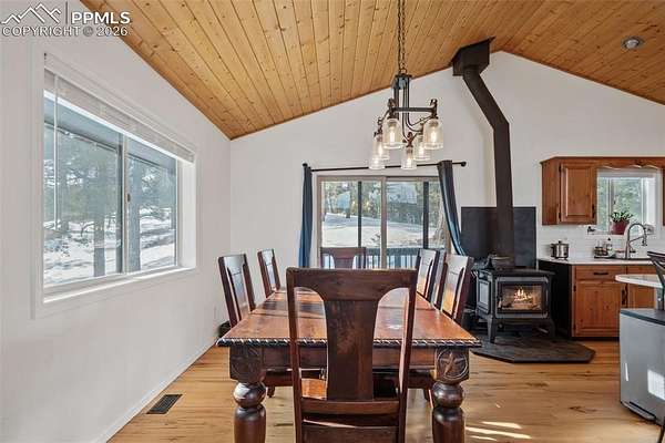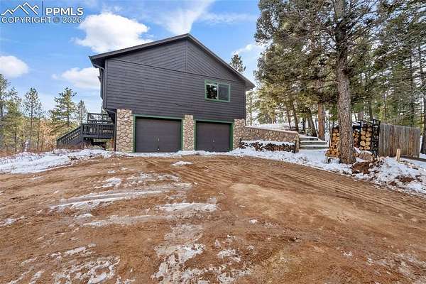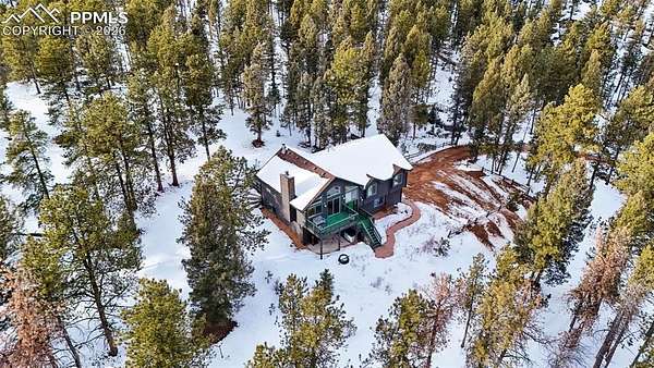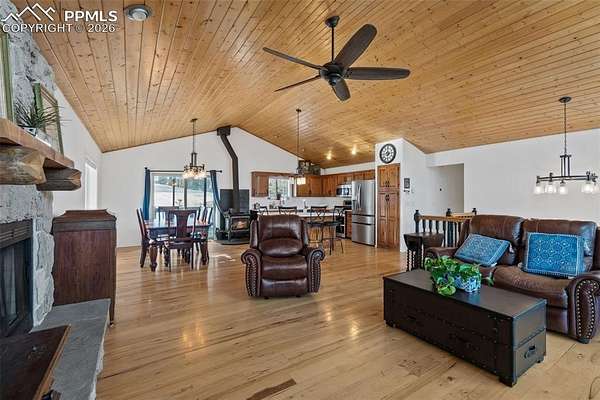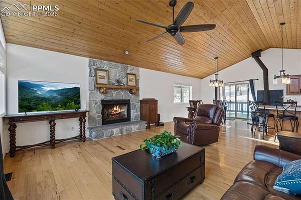 Charming, updated mountain retreat on 5+ secluded acres-yet just minutes from the heart of Woodland Park with shops, restaurants, services, and community events close at hand. This beautifully maintained bi-level home offers 3 bedrooms, 3 baths and 2,188 sf of living space designed for both relaxed everyday living and effortless entertaining. Step inside to gleaming wood floors and an inviting living room crowned with a wood tongue-and-groove ceiling, setting the tone for cozy Colorado mountain living. Big windows frame peaceful views and flood the interior with natural light. The open floor plan flows to a well-appointed kitchen with updated stainless-steel appliances and a central island perfect for morning coffee or casual meals. Warm evenings are calling by the stone-accented wood-burning fireplace and efficient radiant wood stove-ideal for chilly nights at elevation. The main level includes a private primary suite with walk-in closet, plus two additional bedrooms with plush new carpet and thoughtful lighting. A lower level bonus room offers flexible space for media, work, guests or play. Outdoors, enjoy spacious decks off multiple living areas and the tranquility of your own mountain sanctuary-meadows, trees, and quiet trails feel worlds away, yet you're close to everyday amenities in town. RV turnaround, two-car garage and tasteful upgrades throughout add convenience to comfort. A rare combination of serene setting and superb location-your mountain home with room to roam and easy access to all Woodland Park offers. Don't miss it.