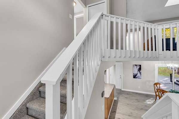 This wonderful 5 BR 2 BA home sits nestled in a private and beautiful wooded setting of 2 acres. Kitchen has gorgeous cabinets, island, and spacious open dining area. Open great room has tall ceilings with a ceiling fan and loft area overlooking. Second floor has a balcony off of loft area, perfect for sitting area or office space. This home has large bedroom sizes, some having ceiling fans and/or double closets. Entertain or relax on the large multi level deck off the back of the home with peaceful and serene wooded setting overlooking the pond. Storage Shed. Updates include a new flooring and paint throughout.