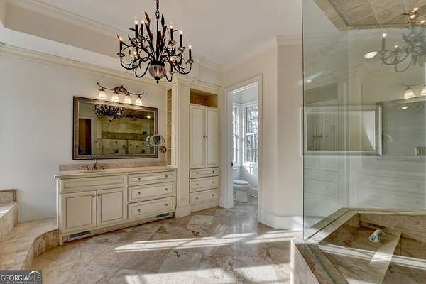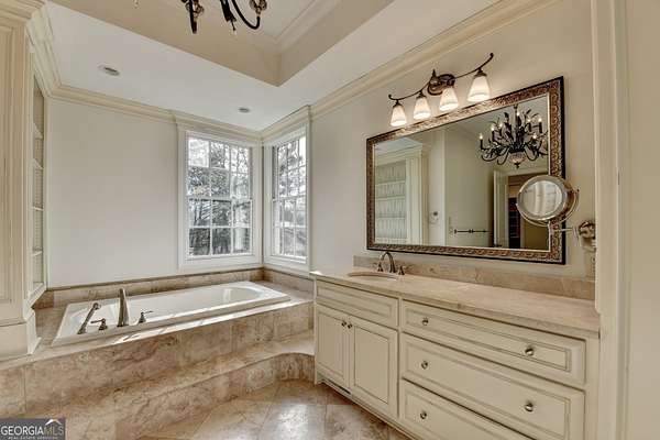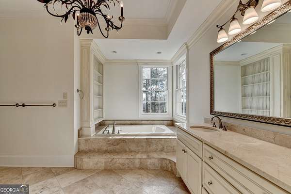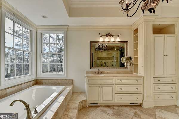 - Bookcases, Double Vanity, High Ceilings, Master On Main Level, Separate Shower, Tile Bath, Tray Ceiling(s), Walk-In Closet(s), Wet Bar