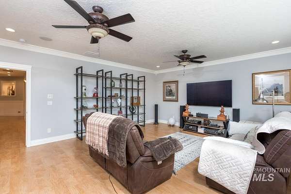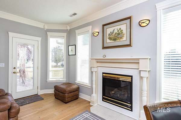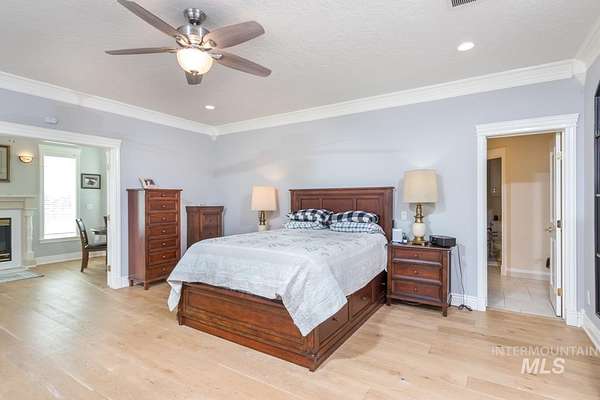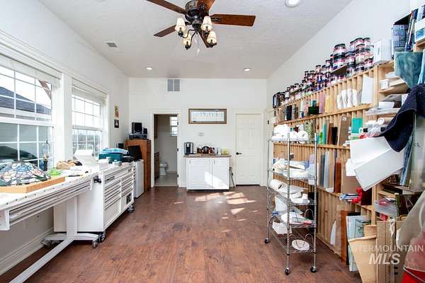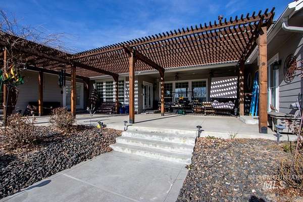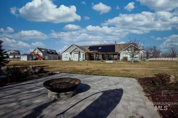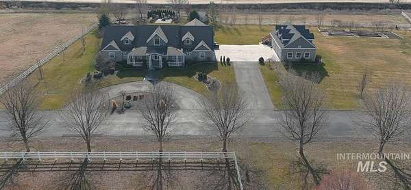 4.5 acres in St James Estates in NE Nampa! About 6 minutes to Ten Mile fwy access, Idaho Center fwy access and Equine/Vet hospital in the Idaho Ford Ctr. 4358 sq ft of charmed country luxury! High end engineered wood provides warmth through out. Show stopper kitchen in the heart of this home w/ ivory corian countertops, soft touch cabinets, breakfast bar, and pot filler. Cook's choice 18x6 walk in pantry. Large 16x10 laundry room with built in desk. Sunny south facing dining area w/ built in desk nook. 3 generously sized ensuite bedrooms. Master features a 17x8 relaxing retreat w/ fireplace and sunny windows. Split bedroom design features a great room down the hall with views to the backyard. Classic formal dining room and ample 15x11 office at the front of the home. 3 car detached garage has attached living qtrs with full bathroom. Above the garage is a 38x20 studio with 15x6 storage closet; add a bathroom and kitchenette to create a potential short term rental. Solar panels and roof installed 2022. Central vac system throughout. Fully fenced & irrigated pasture approx 215x210 sq ft with approx 358 dog leg. South facing back features a relaxing hardscape area for entertaining. Gardener's dream orchard: 5 peaches, 4 apricots, 2 pears, 2 apples(1 has 3 grafted varieties), 2 pluots, 2 cherry, 5 blueberries, raspberries, thornless blackberries; all on drip irrigation.