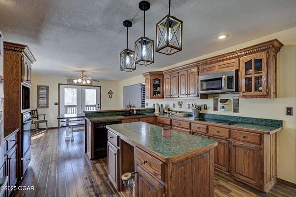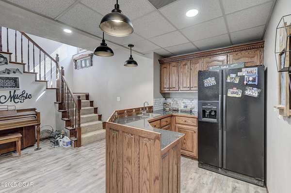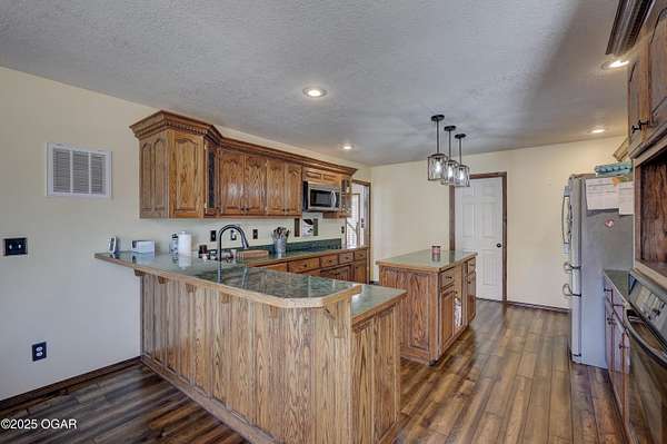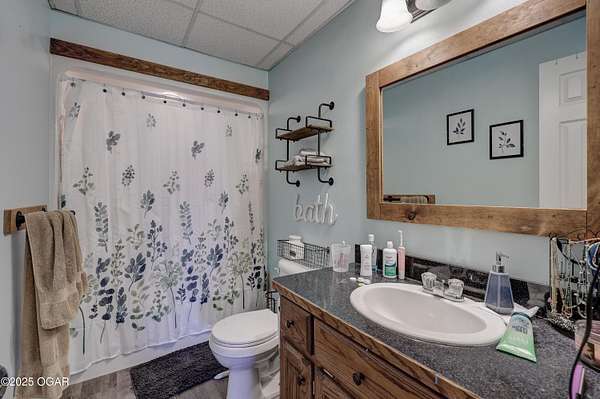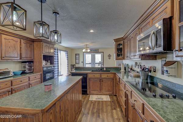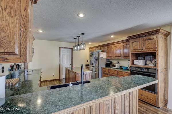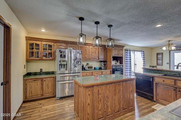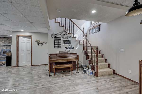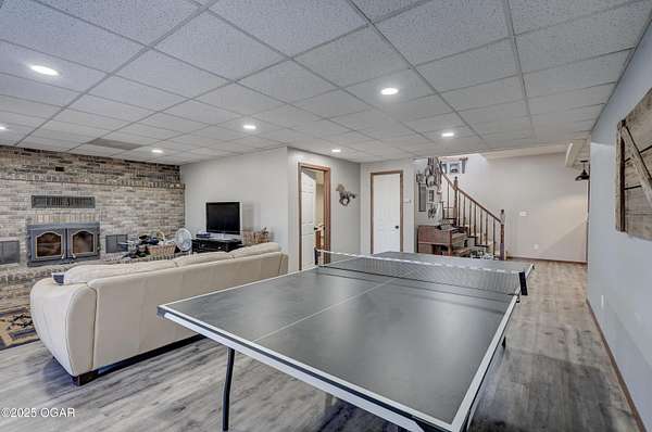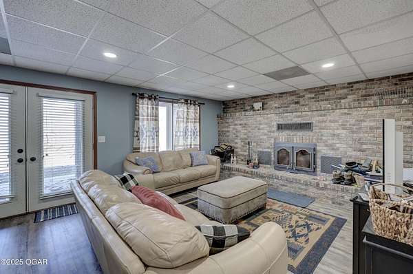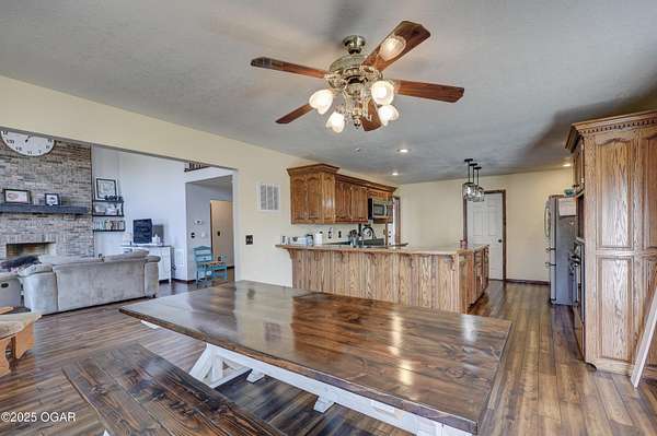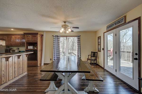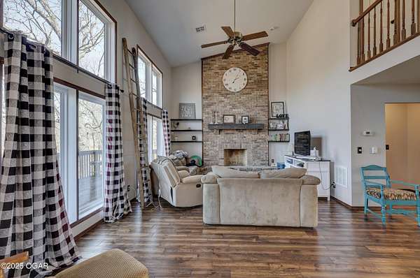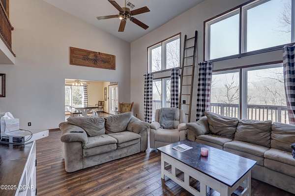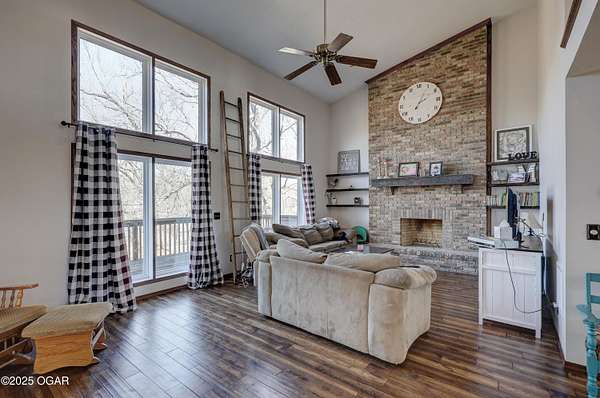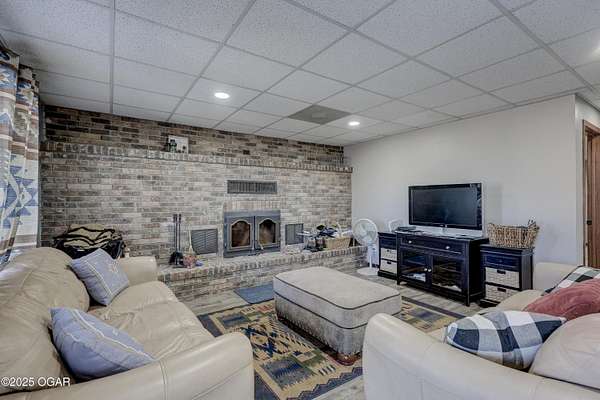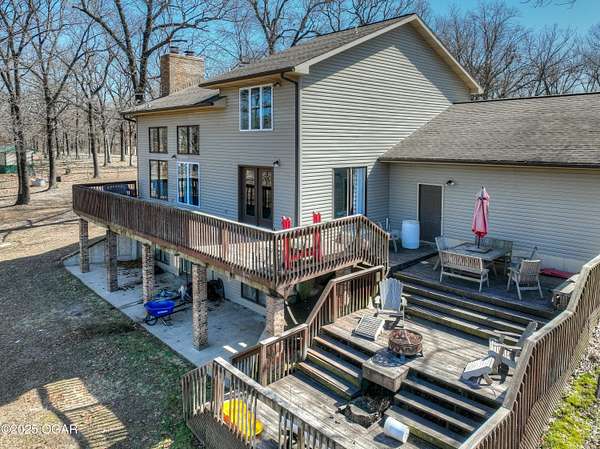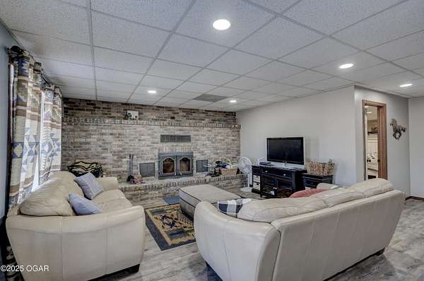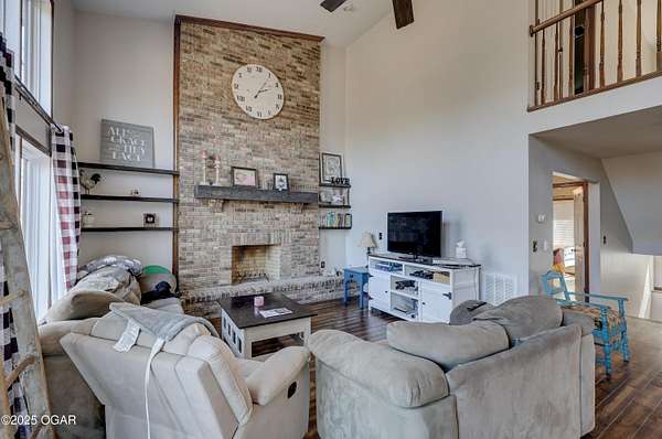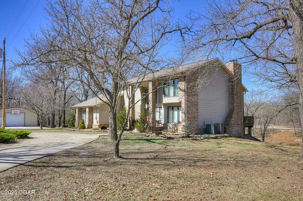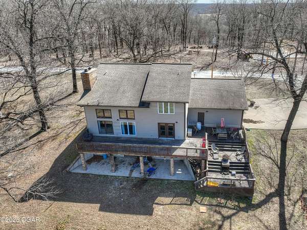 Fantastic home situated on 6.6 acres on the South side of Galena, KS. 4 bedrooms with 2 additional non-conforming bedrooms in the basement. 2 Living spaces with with main floor living room with open fireplace and basement fireplace with insert. Basement is walk out with a wet bar. Newer flooring thrughout the home. Multi level deck looking out onto your fenced 6.6 acres of rolling hills, timber and pasture. 50X31 detached shop A rare opportunity in a highly desireable area.