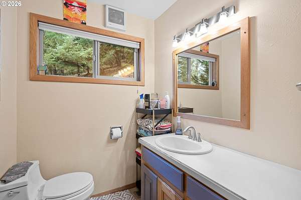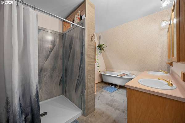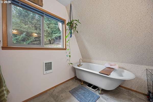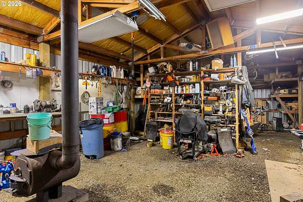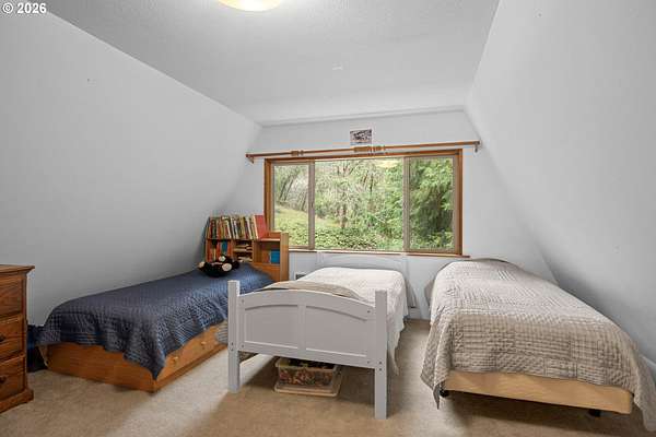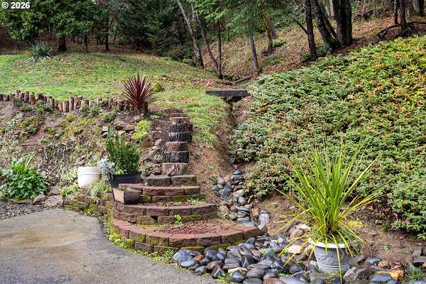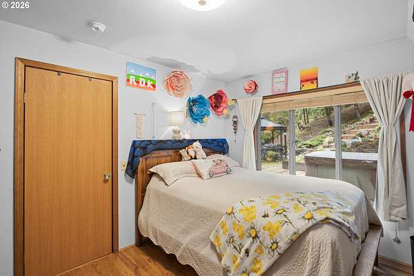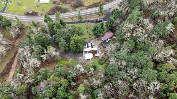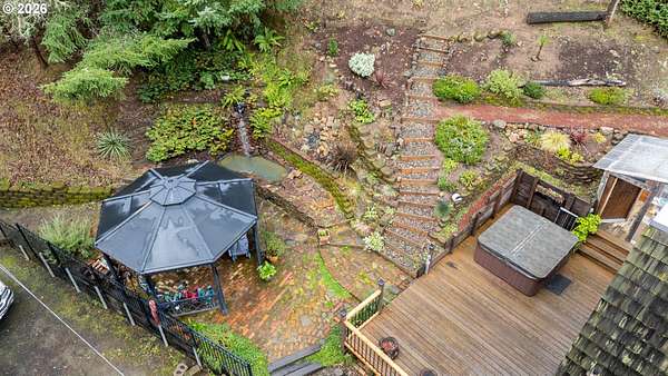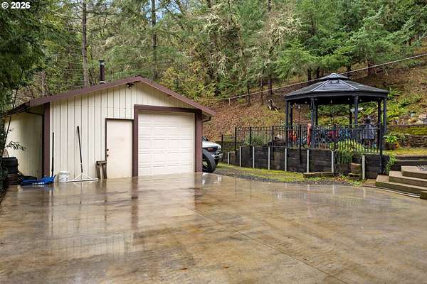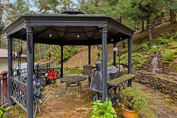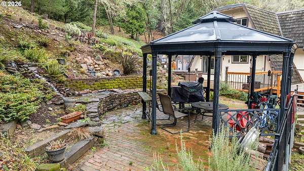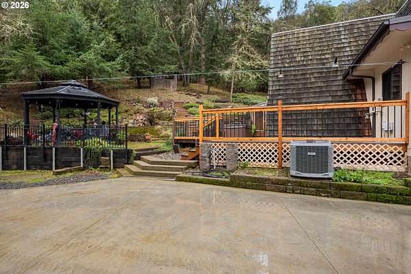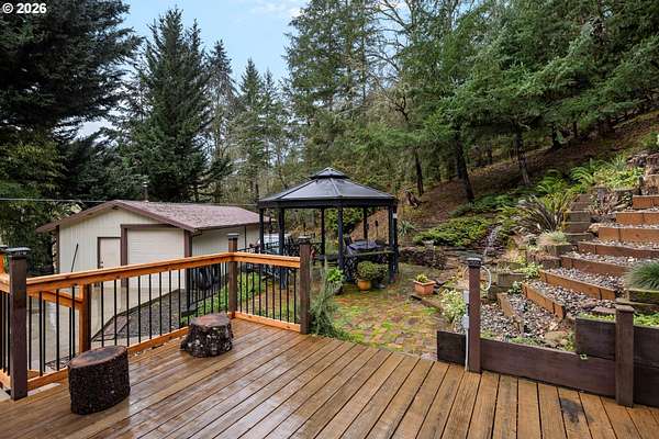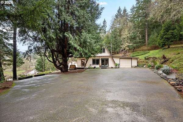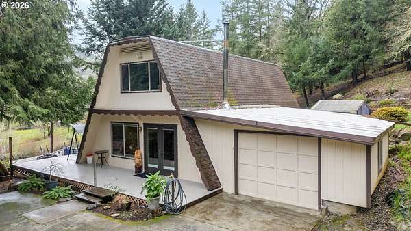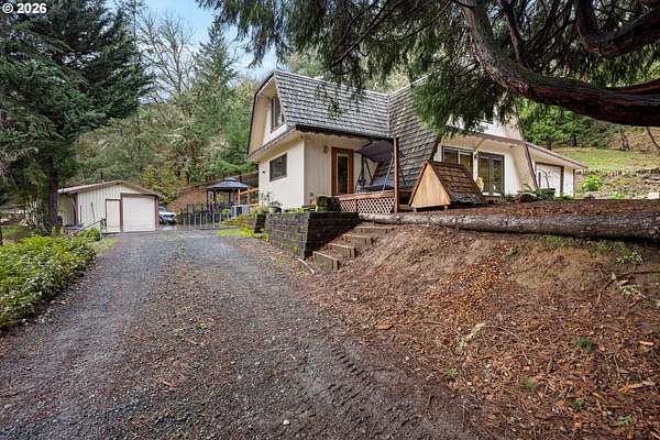 Tucked away on a private 4.6-acre setting, this charming A-frame style home offers the perfect blend of rustic character and modern updates. Step inside to discover oak hardwood floors and vaulted ceilings that create a warm, open feel throughout the 1,913 sq ft, two-story layout. The main level features a comfortable bedroom and convenient powder room, ideal for guests or main-level living. The generous kitchen is designed for both everyday living and entertaining, complete with granite countertops, updated cabinetry, stainless steel appliances, and a prep sink, all flowing seamlessly into the main living space. Upstairs, you'll find two additional bedrooms, including a spacious primary suite. The primary bath has been thoughtfully updated with new flooring, a walk-in shower, a classic clawfoot bathtub, and a double sink vanity, creating a relaxing retreat. Step outside to enjoy the home's exceptional outdoor amenities. A new Trex deck extends the living space, while a Douglas fir back deck hosts a freestanding hot tub, perfect for unwinding in a peaceful, natural setting. The property also features a gazebo, water feature, and beautifully maintained landscaping. For hobbyists and homesteaders alike, there is a large workshop, greenhouse, chicken coop, established garden area, and mature fruiting plants including plum and fig trees and grape vines. This private acreage offers endless opportunities to enjoy nature, privacy, and a truly unique lifestyle. Call today to schedule a private tour!