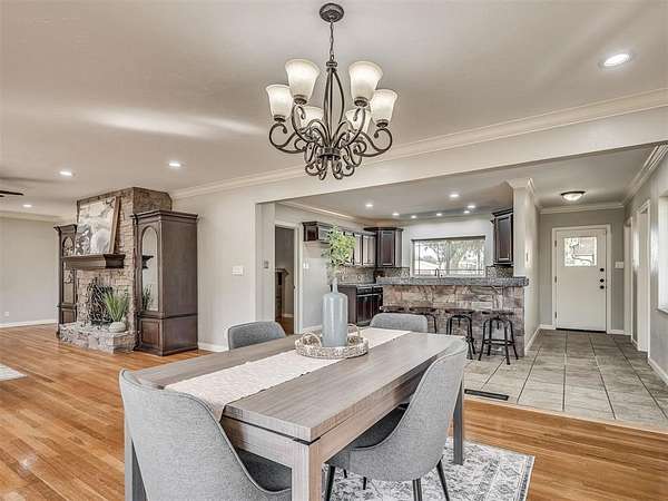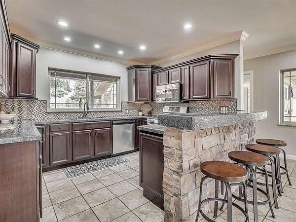 So much space for activities! Imagine hosting your holidays here, there is time to make that happen! This home is full of character and charm and built to entertain or host a large family. It is situated perfectly on just under 2 unrestricted acres, that's right unrestricted burn fires, bring your farm animals, let your imagination run wild. The home has several living spaces or flex spaces which could easily be utilized as a 4th or 5th bedrooms, multiple possibilities to configure it to the needs of your family. There are 3 defined bedrooms, 3 full baths, a huge primary suite (added on by the current owner) remodeled kitchen with gas stove, breakfast bar and window overlooking the back yard, a basement, an upstairs bonus room, a flex space off the second living room, and so much more! This property welcomes you with beautifully manicured landscaping and a cozy front porch, a great place to watch the sunrise and enjoy your morning coffee. Once inside, find original hard wood floors in many areas, brand new carpet in the bedrooms, lovely stone fireplaces, split bedroom plan, and a wide open living and dining room. Outside find the most fabulous back patio with outdoor kitchen and fireplace (also accessible from the primary bedroom) the perfect place to enjoy an Oklahoma sunset and host family or guests. This property also includes a barn and the cutest chicken coop! Don't miss your opportunity to own this piece of country living and own your own private retreat an escape to the country.