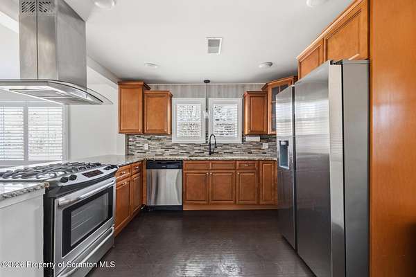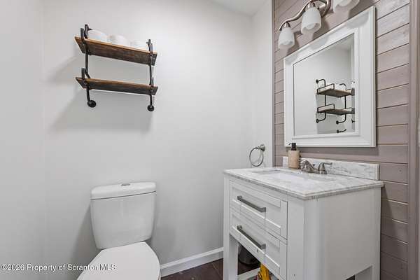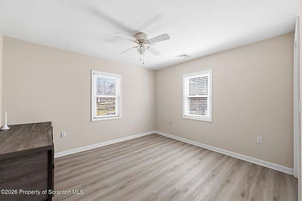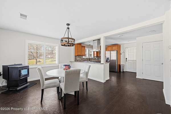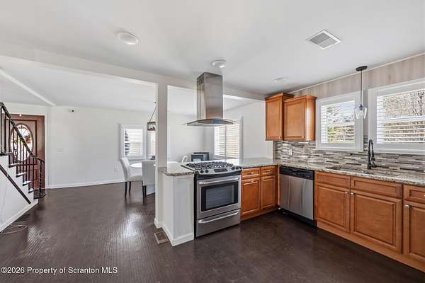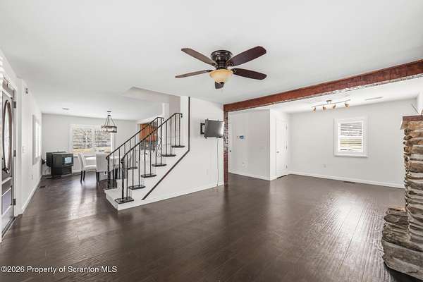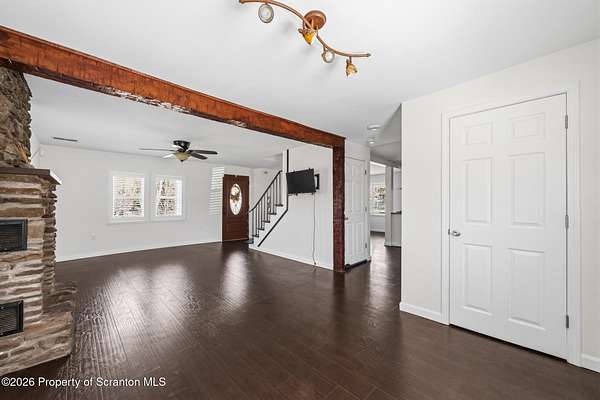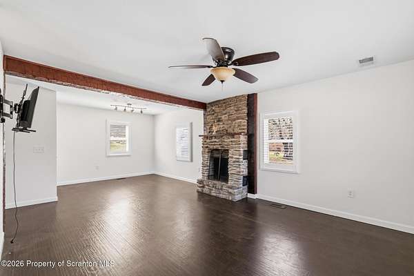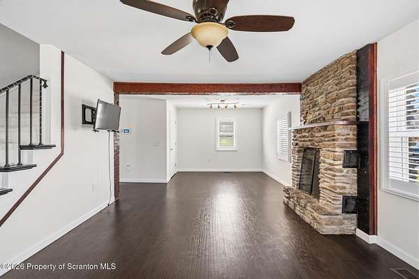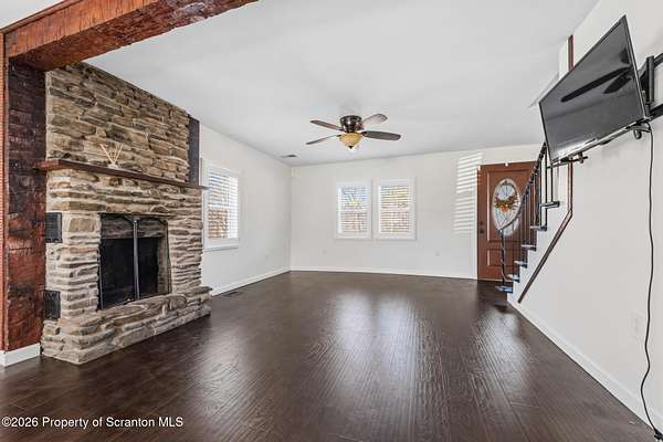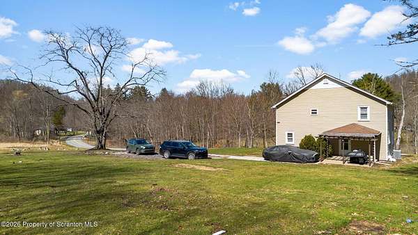 Beautifully renovated and move-in ready, this stunning 3-bedroom, 2.5-bath home sits on 3 acres in the highly desirable Abington Heights School District. Nearly everything is newer, including the siding, roof, windows, electrical, plumbing, insulation, drywall, and HVAC, offering peace of mind and modern comfort throughout. The open-concept first floor features a gorgeous updated kitchen with granite countertops, stainless steel appliances, and a glass tile backsplash, all flowing into a spacious living area highlighted by an original stone-faced wood-burning fireplace. The primary suite offers a full bath and walk-in closet, creating a private retreat. Step outside to enjoy the large yard, perfect for entertaining, gardening, or simply relaxing in your own peaceful setting. A rare combination of acreage, updates, and location, this home is a must-see.