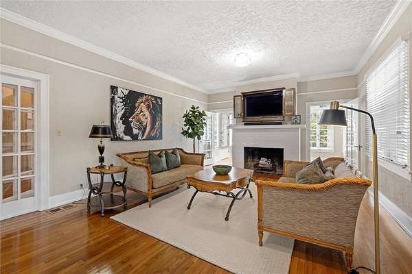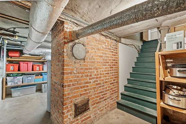 Original architectural elements remain intact, including 9–10 foot ceilings, terracotta tile, well-preserved plaster walls, and oak and heart-of-pine flooring. Storage is abundant, with multiple walk-in closets, a cedar closet, and a basement accessible from both inside and out.