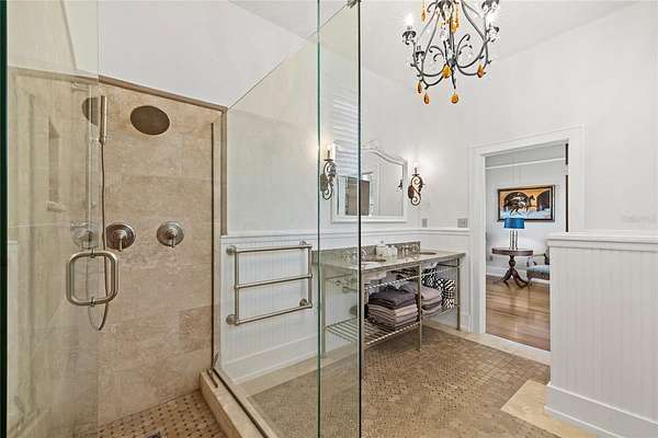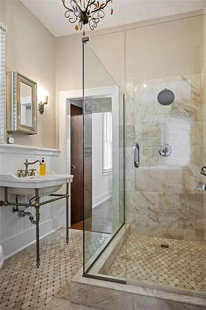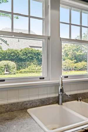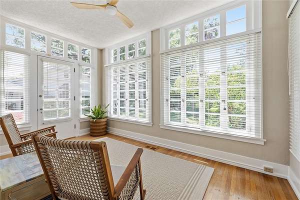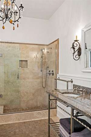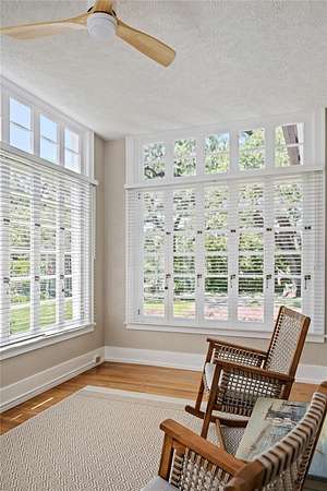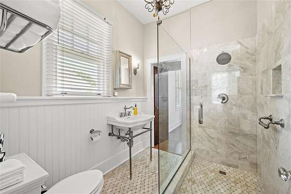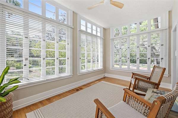 Upstairs, the primary suite offers built-in shelving, dual closets, a private sunroom, and a beautifully updated bath with wainscoting, double vanity, and a large walk-in shower. A fifth bedroom adjacent to the suite provides flexibility as a nursery, office, or sitting room, with its sunroom currently serving as an expansive closet. Two additional guest bedrooms share an updated Jack-and-Jill bath, wrapped in Italian marble.