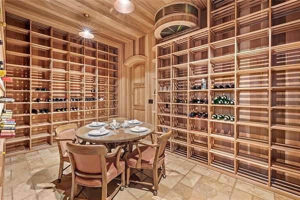 A true highlight is the cedar-lined, temperature-controlled 12x19 wine room, finished with travertine floors, a private patio entrance, and capacity for over 2,000 bottles.