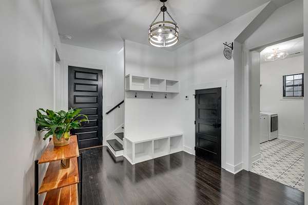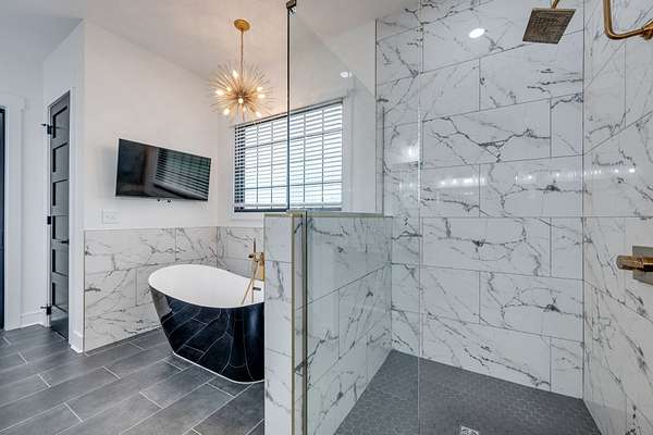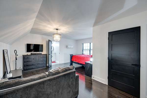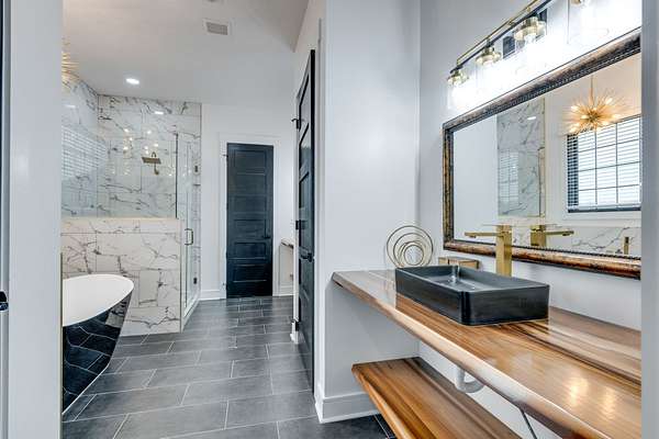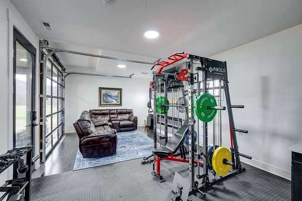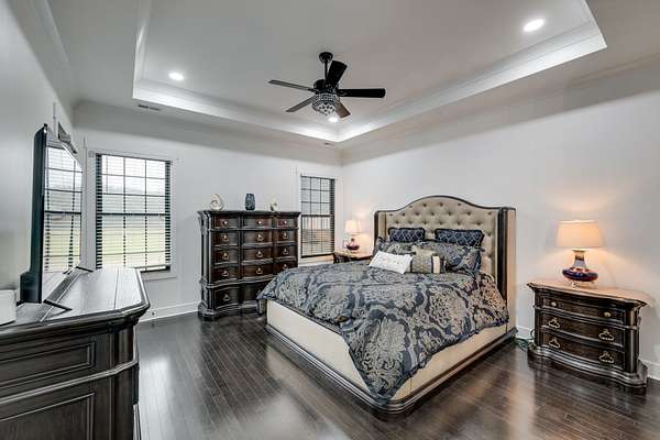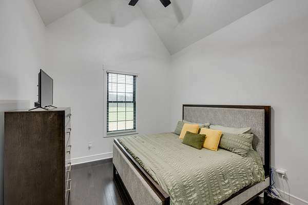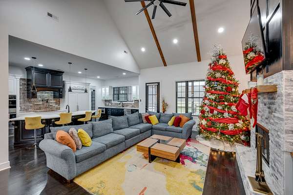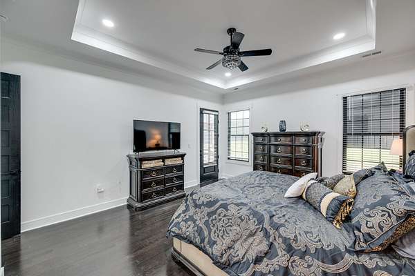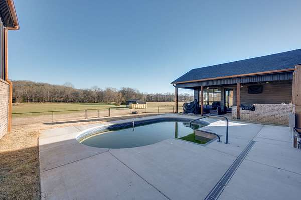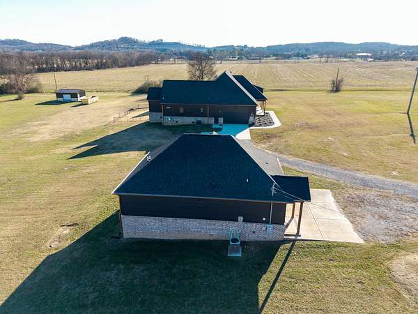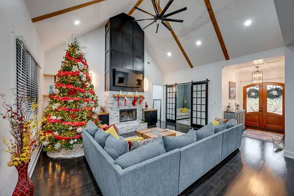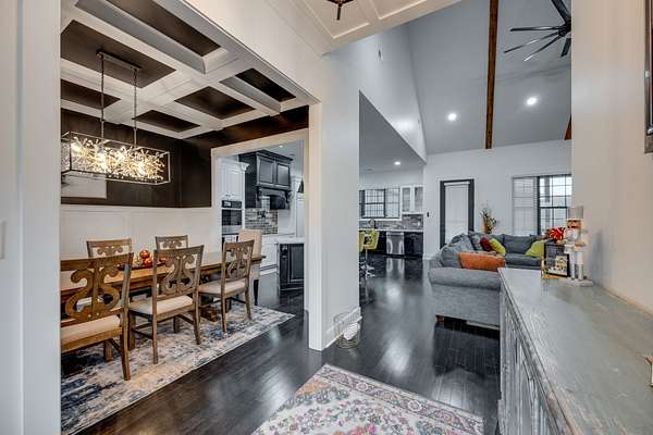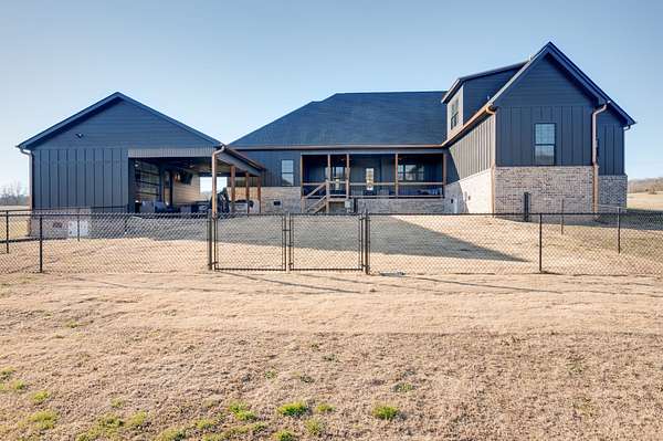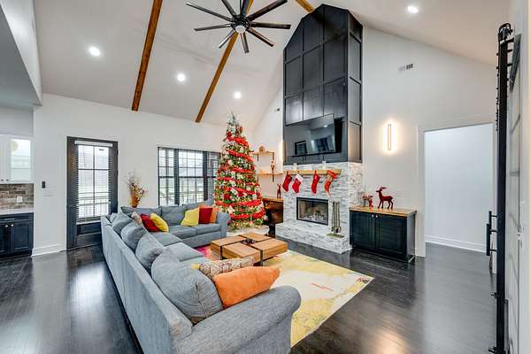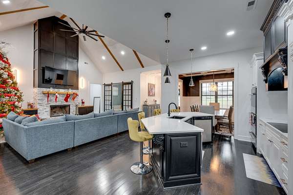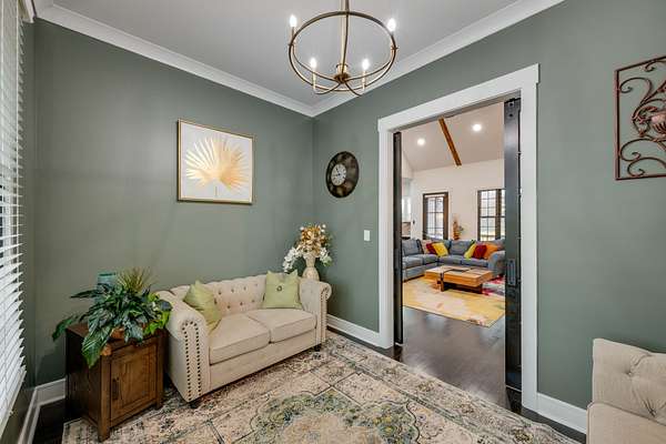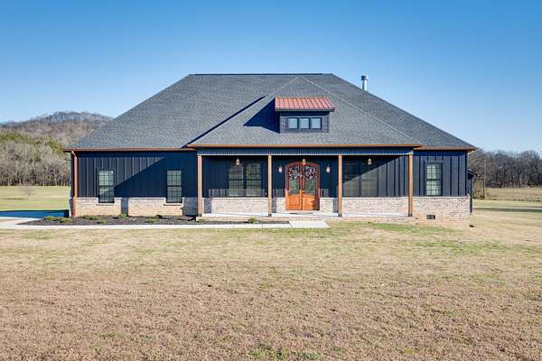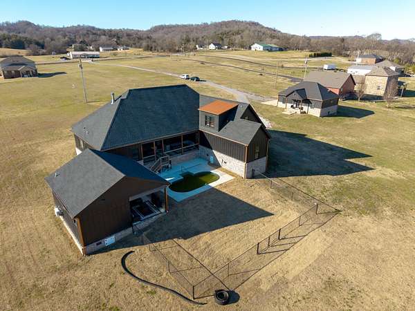 405 Shelbyville Hwy serves as the primary residence and is thoughtfully designed for both everyday living and entertaining. The home features wood flooring throughout, a formal dining room with coffered ceilings, and a great room with soaring ceilings, stacked-stone wood-burning fireplace, and custom built-in cabinetry. The isolated primary suite offers a spa-like retreat with a soaking tub and tiled shower. Most areas of the home feature 8-foot 5-panel doors, adding to the upscale architectural feel.