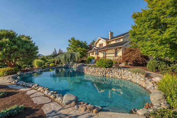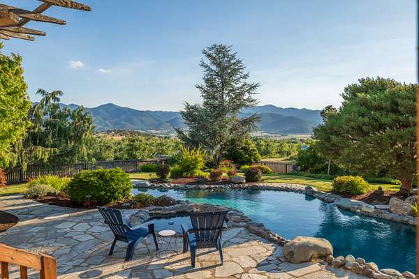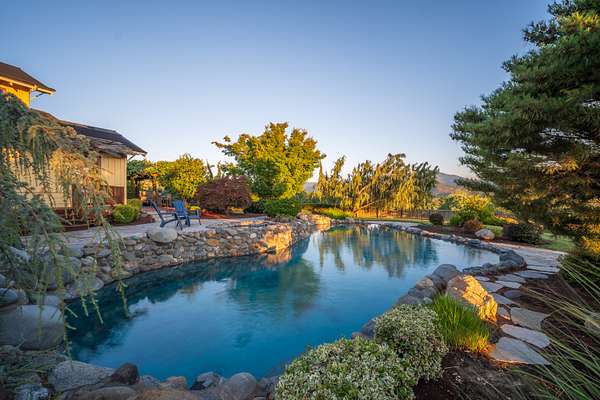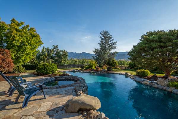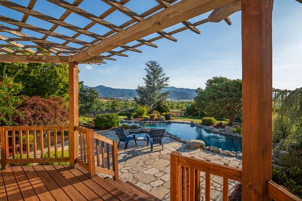 Outdoor living is equally impressive, with patios off the kitchen and living room offering seamless indoor-outdoor flow. These outdoor spaces are ideal for enjoying Southern Oregon's mild climate and provide room for dining, lounging, or simply taking in the view. The custom pool with incredible rock design, built-in hot tub and sauna deliver great recreational amenities for the whole family. The ground around the home features beautiful mature landscaping and trees.