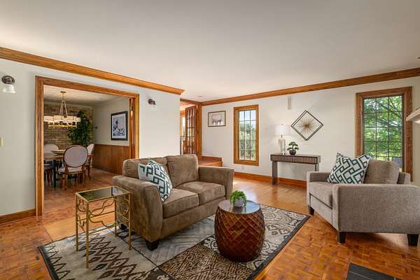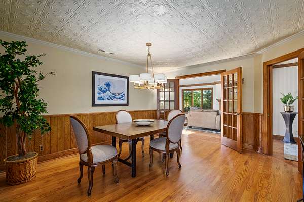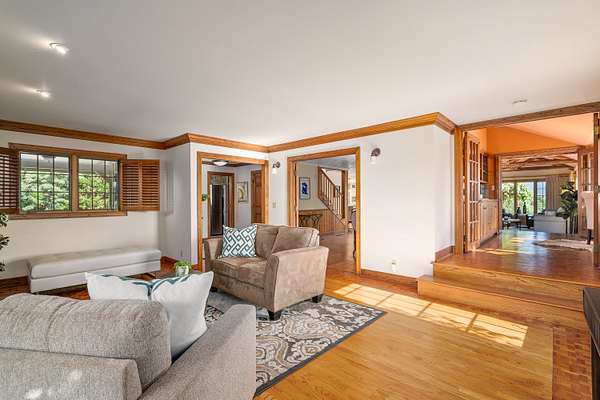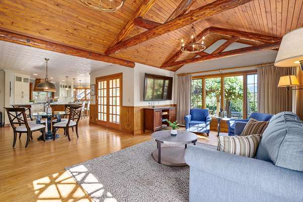 The main level features multiple living and dining spaces ideal for both relaxed daily living and entertaining. Both wood moldings and exposed beams add a rustic elegance, while windows throughout the home frame sweeping views of the valley and bring in natural light. The interior features a combination of warm wood tones, curated finishes, and functional flow that reflects both craftsmanship and utility.