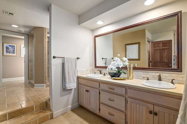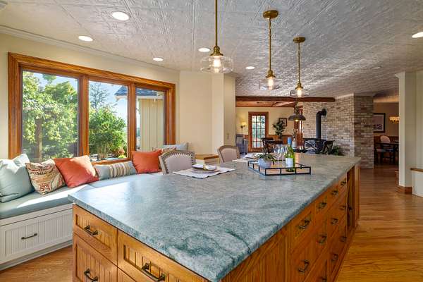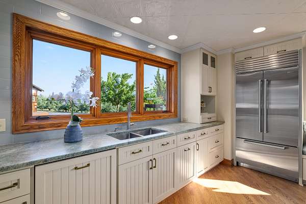 The kitchen is a showpiece of the home--completely updated and anchored by leathered granite countertops, a large center island, and high-end appliances. These include a Sub-Zero refrigerator, professional-grade range, and more. Whether working at the kitchen sink or relaxing on the built-in seating bench, the layout is designed to make the most of the surrounding views, with sightlines that stretch across to the distant mountains. Adjacent to the kitchen is a breakfast sitting area that connects to the living room. A formal dining room, great room, office, and utility room complete the main level.