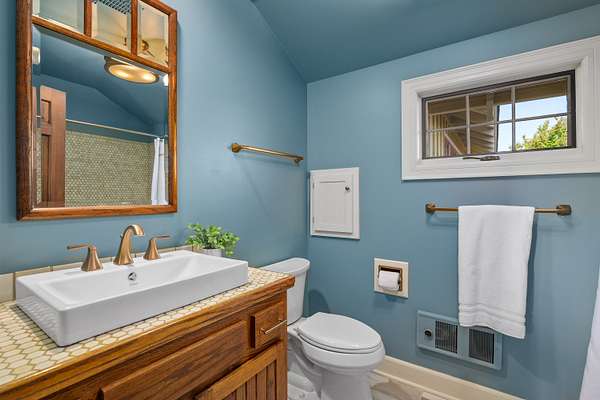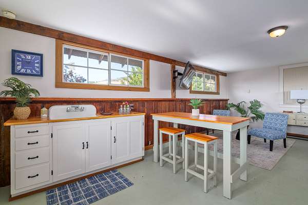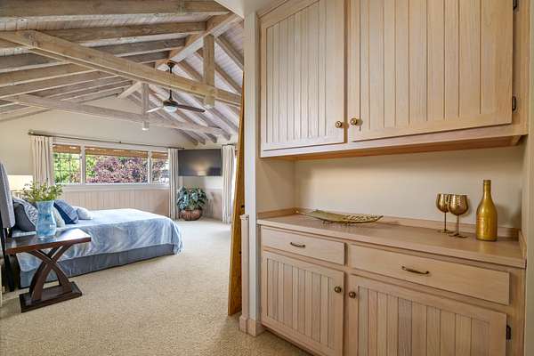 Barn ~ The barn is a classic structure totaling approximately 2,850 square feet, offering a timeless, rustic aesthetic that complements the property's character. The main level features a mix of concrete, asphalt, and dirt flooring with generous space for equipment, storage, or workshop use. You'll also find a wood-floored workspace, and a canning or storage room. Accessed via a private exterior staircase, the upper level includes a fully finished guest studio with a full bathroom. This charming space captures the warmth of authentic farmhouse design and serves well as guest accommodations, an artist's studio, or a home office. With power, privacy, and picturesque surroundings, the barn adds both functionality and charm to the estate.