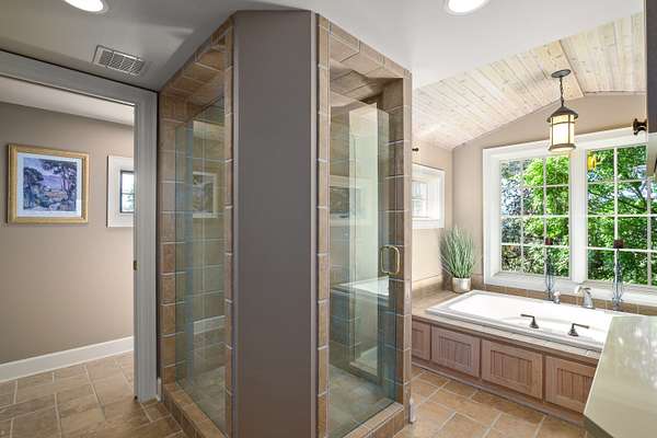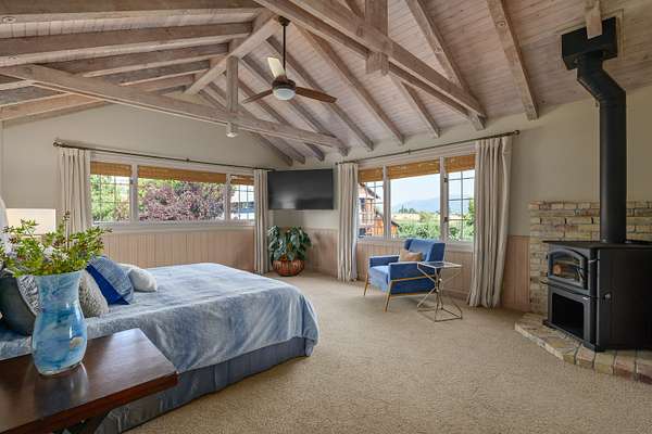 The master suite is a private retreat, complete with vaulted ceilings, wood beams, a cozy woodstove, and picture windows that offer unobstructed vistas. The en suite bathroom is generously appointed with dual vanities, a soaking tub, walk-in shower, and a layout designed for privacy and relaxation. Two additional guest bedrooms and a guest bathroom round out the second level.