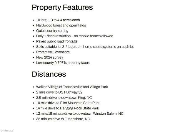Est $482/mo2 acre Lot #9A with a nice, mostly level and open field building site located outside the city limits of Tobaccoville in Forsyth County, NC featuring approx 600 feet of paved public road frontage with 1 acre field ~ new home site surrounded on two sides by a hardwood forest ready for constructing your new home. Access to power & cable. Lot has been evaluated, soils will support 4 bedroom septic system. Walking distance to Park. Additional 2.7 acre lot available. Agent owned. Visit listing agent's website for more details, interactive map, & video tour