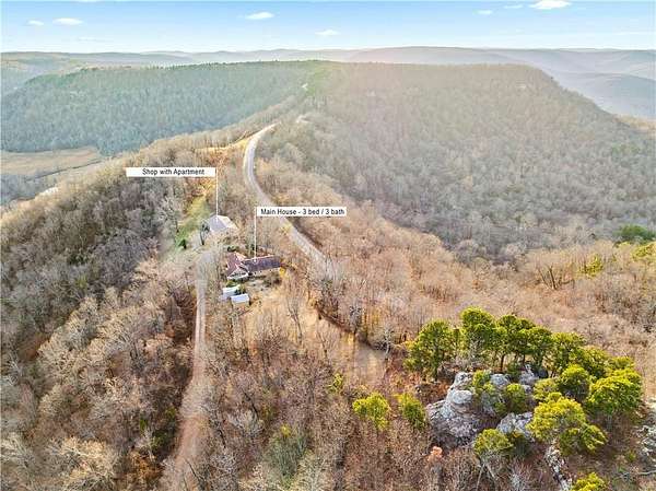 Versatile, versatile, versatile!! This property offers both a place to call home and an opportunity for extra income. Sitting on 36 acres atop a ridge overlooking the Ozark National Forest, you'll experience true 180-degree views. The main house includes 3 bedrooms, 3 full bathrooms, 2 sunrooms, and a walkout balcony off the spacious primary suite. The yard is fully fenced for pets, handicap accessible, and set up for a whole-home generator. The 80x40 shop adds even more value with a separate 2-bedroom, 1-bath apartment that includes a kitchen, laundry, and private parking--perfect for guests, rental income, multi-family living, or whatever you need it for! In addition to the generator, you'll find a small orchard, raised garden beds, and an oversized deep pantry (perfect for canning), giving you the ideal setup for self-sustainable living. And the location? That's one of the best parts. All on paved roads, just 0.5 mile from Sam's Throne and only 9 miles from the Buffalo National River!