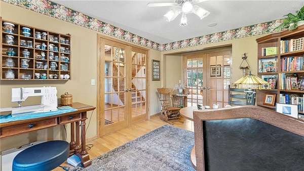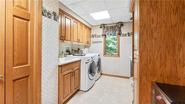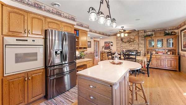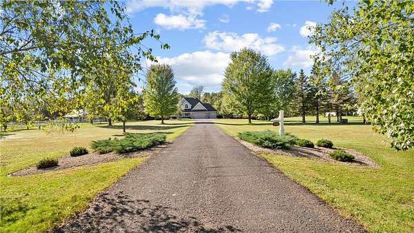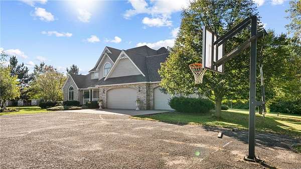 The custom-built home features a new lifetime-guaranteed roof, genuine oak hardwood floors throughout the main and upper levels, and a stunning two-story, vaulted ceiling, great room with dramatic 2-sided brick gas fireplace and open catwalk above. The spacious kitchen is designed for gathering, complete with black stainless steel appliances and seamless flow into a bright four-season sunroom overlooking woods and beautifully landscaped grounds.