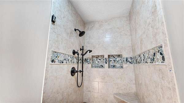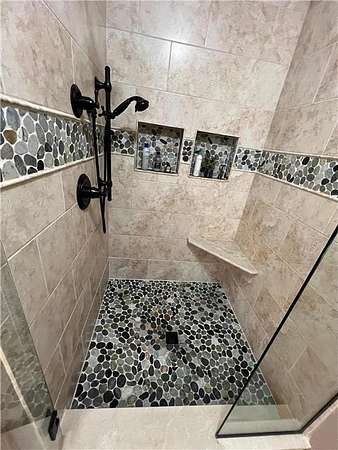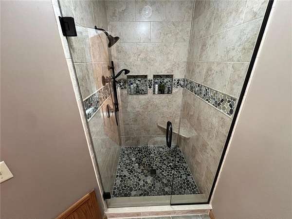 The main-level primary bedroom offers an en-suite spa-like retreat with Pearl jetted soaking tub and a custom walk-in tile shower featuring natural bedrock and dual shower heads. Upstairs includes three additional bedrooms and a full bath, while the lower level is built for entertaining with flexible spaces for fitness, games, crafts, and storage.