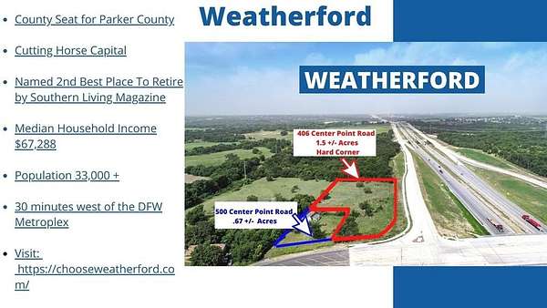 Approximately 1.5 acres at the Southwest Hard Corner of Interstate 20 and the New East Loop at Center Point Road. The Gateway To Weatherford. 75,000+ car count and strategically located between Hudson Oaks and Weatherford. Near new Costco on the NW corner and Weatherford Point, a new multi tenant shopping center anchored by Sprouts on NE corner. HEB, WalMart, Cheddars, Urban Air, 336 multi family unit, Creekside at Hudson Oaks and 332 multi family unit, Birchway just one exit east. Recently included in the City of Weatherford's TIRZ zone. Additional acreage available.