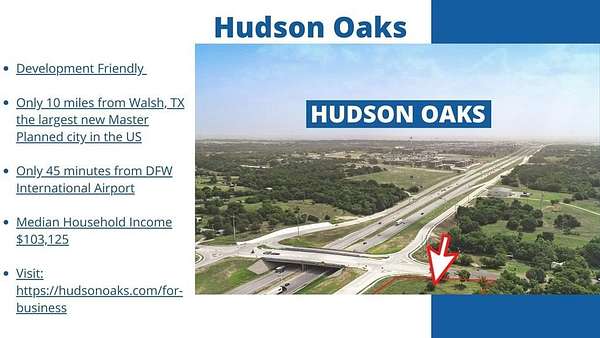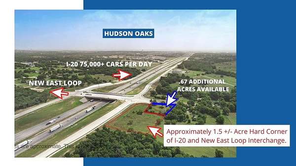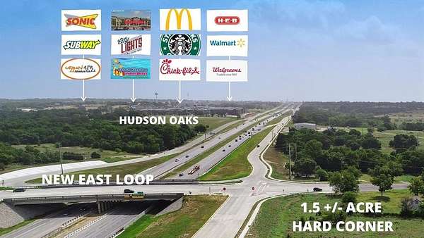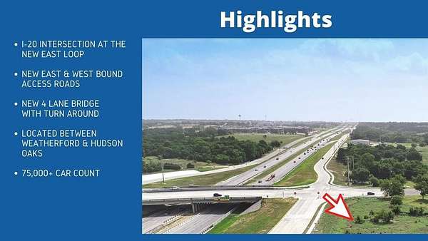 Approximately 1.5 acres at the Southwest Hard Corner of Interstate 20 and the New East Loop at Center Point Road. The Gateway To Weatherford. 75,000+ car count and strategically located between Hudson Oaks and Weatherford. Near new Costco on the NW corner and Weatherford Point, a new multi tenant shopping center anchored by Sprouts on NE corner. HEB, WalMart, Cheddars, Urban Air, 336 multi family unit, Creekside at Hudson Oaks and 332 multi family unit, Birchway just one exit east. Recently included in the City of Weatherford's TIRZ zone.