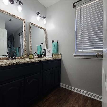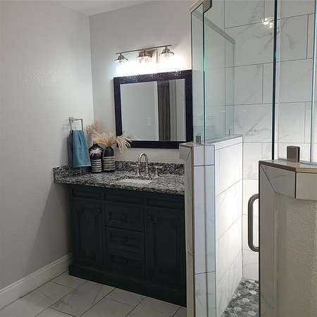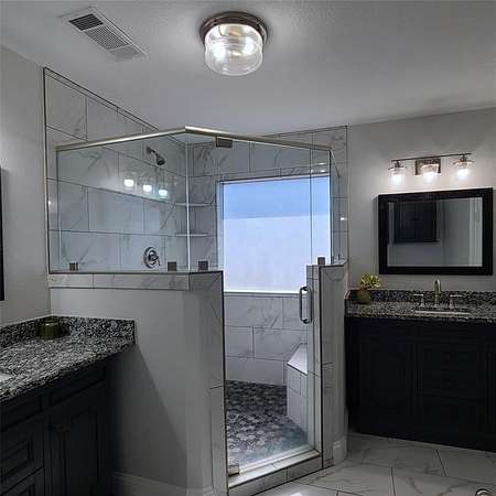The primary bathroom has been luxuriously remodeled, featuring an oversized glass shower, double furniture-style vanities, and elegant marble style shower walls and flooring. The secondary bathroom is brand new, showcasing a tub and shower combo with tiled walls and contemporary finishes. At the heart of the home, the kitchen is a true showstopper--complete with a farmhouse stainless sink, smooth surface cooktop, wall oven, walk-in pantry and an oversized island with seating on two sides plus additional storage on both ends, ideal for both entertaining and everyday living.
