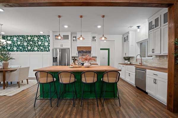 The heart of the home features vaulted ceilings, abundant natural light, and an open-concept living space anchored by a well-designed kitchen with farmhouse sink, gas range with pot filler, custom vent hood, and a large island with seating. The kitchen flows seamlessly into the dining and living areas, framed by expansive windows overlooking the backyard. Just outside, a covered patio with gas grill line extends the living space and was intentionally planned with future courtyard or pool potential.