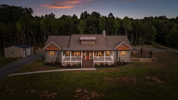 Outdoors, approximately two acres are cleared and usable, complemented by additional wooded acreage for privacy. The wraparound front porch creates a welcoming approach, while the encapsulated crawl space adds peace of mind. An oversized two-car garage supports daily needs, and a 550+ sq ft metal outbuilding with roll-up and man door access provides excellent space for hobbies, equipment, or workshop use.