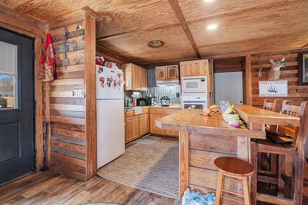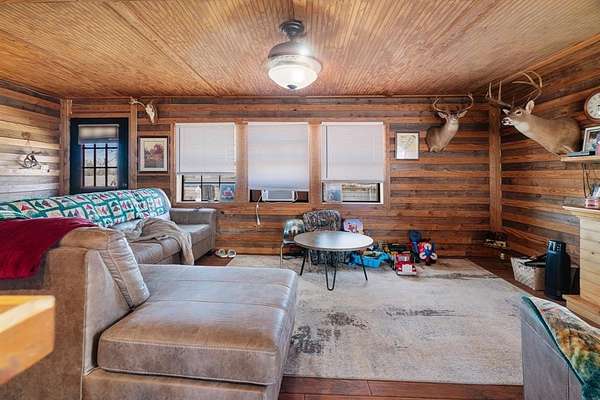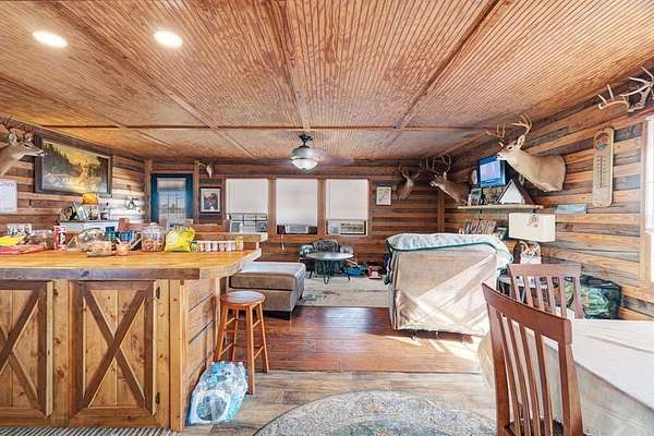 An exceptional investment opportunity featuring four homes, two large workshops, a hay barn, and multiple storage buildings, all set against the most tranquil lake backdrop. The main residence offers 1,885 sq. ft. of recently updated living space with 2 bedrooms, a spacious living room, and a beautiful kitchen showcasing a copper metal ceiling, granite countertops, and custom cabinetry. A charming 1-bedroom log cabin with an 8x30 porch and metal roof overlooks the lake--perfect for weekend retreats or rental potential. The third home includes 2 bedrooms with an open living and kitchen area and a generous porch ideal for enjoying lake views. The fourth home, the original residence, features 2 bedrooms, a large living room, and a screened-in back porch.