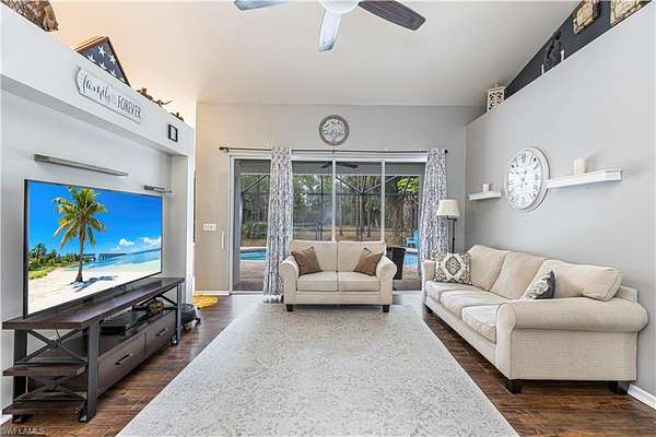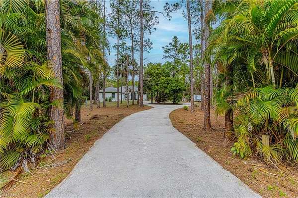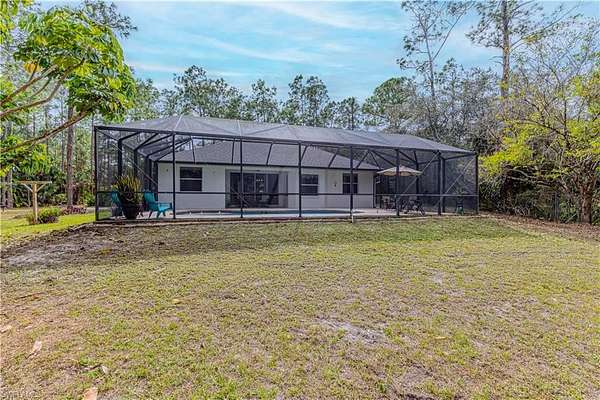 Quality-built Gulfstream home set on 2.73 private acres, surrounded by lush tropical landscaping and true Old Florida charm. This peaceful retreat is framed by mature bougainvillea, fruit trees, pine, and majestic Eureka palms, offering unmatched privacy and a serene setting. Inside, you'll find a spacious, open layout with no carpet throughout. The chef's kitchen features honey-colored granite countertops, solid oak cabinetry, ample prep space, and room to gather. The owner's suite is a true retreat, complete with tray ceiling, walk-in closets, and an adjoining spa-style bath offering dual sinks, a jetted tub, and a large step-down stone shower. Step outside and enjoy the ultimate Florida lifestyle. The property features a concrete pool with stamped concrete sunning deck and LED lighting, screened-in lanai, irrigation system, and a concrete fire pit perfect for evenings under the stars. There is a fenced pet run, ATV trails, and plenty of open space for all your toys. The oversized covered garage includes additional outlets, and the property is equipped with an RV hookup with water and power. Yes, there is even a private gun range tucked away in the backyard for those who appreciate space and privacy. Additional highlights include a newer washer and dryer, newer water system, and a thoughtful setback that delivers peace, quiet, and tranquility without feeling remote. Move-in ready and incredibly private, yet conveniently located just a short drive to Naples' world-famous sugar-sand beaches, dining, shopping, and entertainment. This is a rare opportunity to own acreage, privacy, and modern comfort all in one.