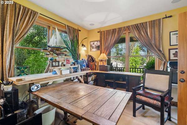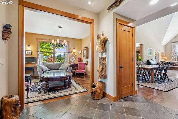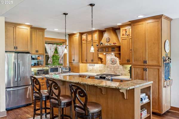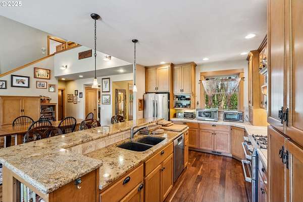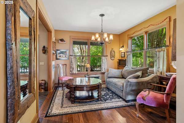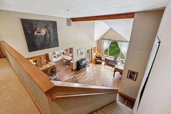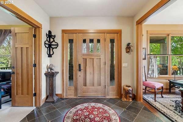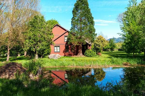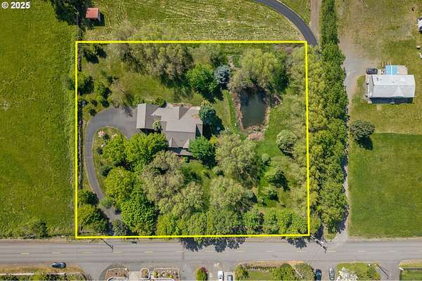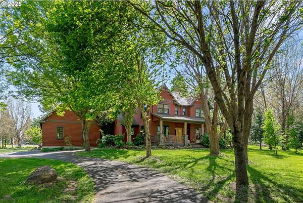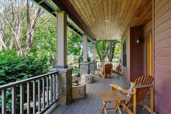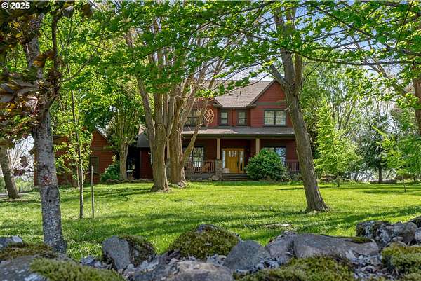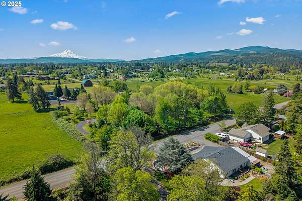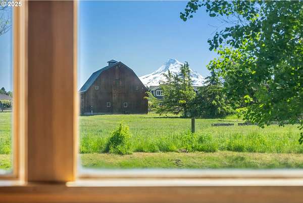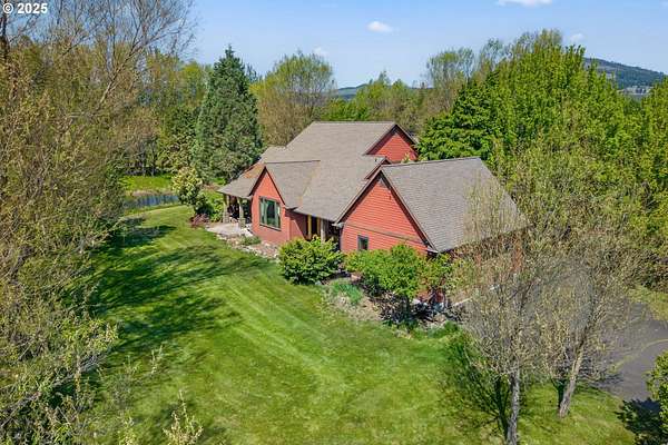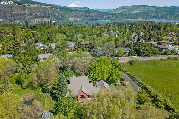 Quality-built 2004 Craftsman on 1.78 acres of level, private land with breathtaking Mt. Hood views. This 2,438sq ft, 4-bedroom, 2.5-bath property offers a rare blend of comfort, flexibility, and timeless design. A welcoming covered front porch sets the tone, perfect for relaxing and taking in the peaceful surroundings and local wildlife. A historic stone wall dating back to the early 1900s borders the north and east sides, adding charm, character, and a sense of privacy. Inside, the flexible layout features a formal living room, dedicated office or den, and a vaulted great room filled with natural southern light and stunning mountain views. The kitchen is designed for everyday living and entertaining, with stainless steel appliances, rich wood cabinetry, a dining nook, and a wine bar. A spacious utility room adds convenience with built-ins, washer and dryer, and a dog washing station, ideal for pets and active lifestyles. The main-level primary suite offers a private retreat with a jetted soaking tub, dual vanities, walk-in closet, and direct access to a covered patio. Upstairs, three additional bedrooms provide versatility, including an oversized room perfect for a second office, gym, or playroom. The grounds are truly special- mature trees, multiple fruit trees (pear, cherry, plum), and a large pond with a meditation rock create a serene, park-like setting. Enjoy watching Mallard ducks on the water and the occasional great blue heron visit. A circular driveway leads to an oversized attached two-car garage. Ideally located on Hood River's westside, this property offers peaceful living with easy access to schools, trails, and town. A rare opportunity to own a beautifully maintained home with spectacular views, usable land, and a truly unique setting.
