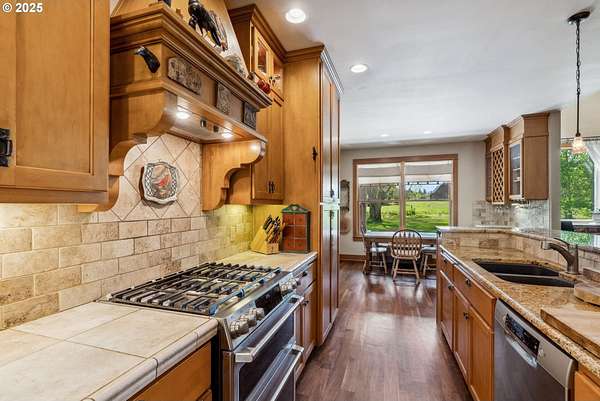 - Dishwasher, Free Standing Gas Range, Granite, Island, Range Hood, Stainless Steel Appliance, Tile, Wine Cooler