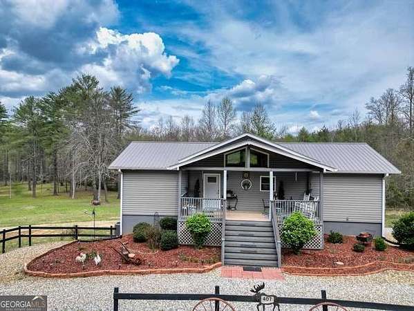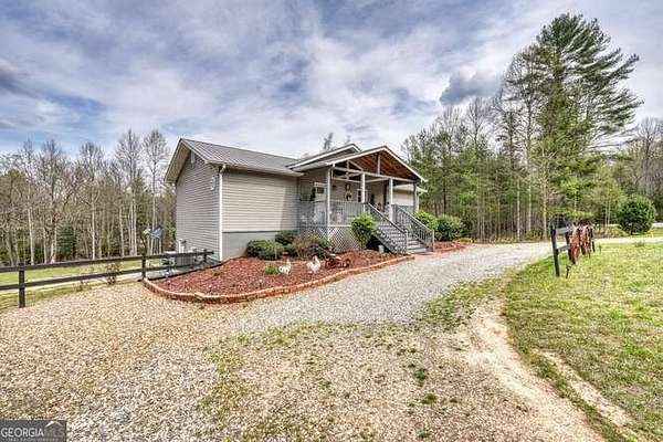 4.97 ACRES LEVEL & GENTLE LAND WITH CREEKFRONTAGE! Home built in 2020 well maintained, cathedral wood ceilings in great room and on both front and back covered porches, Beautiful granite counters and island, pantry, soft close cabinets, stainless appliance. Split plan with large primary and guest room and baths. LIGHT AND BRIGHT! Finished basement for lots of added living space! Two storage sheds, fire pit area ,raised garden beds, take a stroll down to the creek and enjoy this very walkable property. Lots of room to add garage,circular drive and additional driveways and parking. Convenient location close to Lake, Blairsville and Murphy! This home is in excellent condition and feels like new HOME.