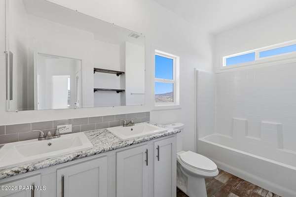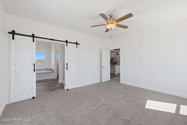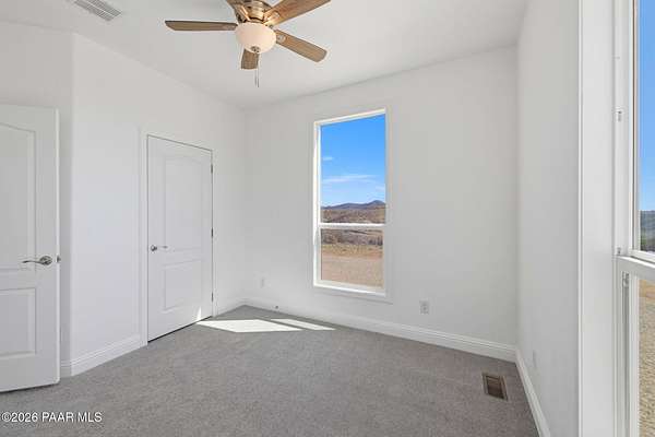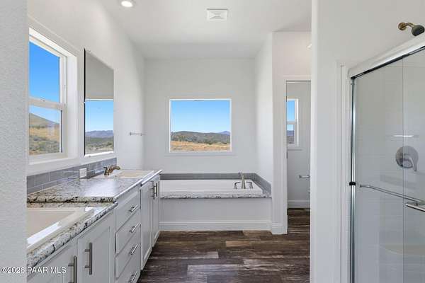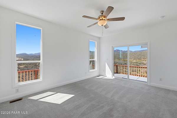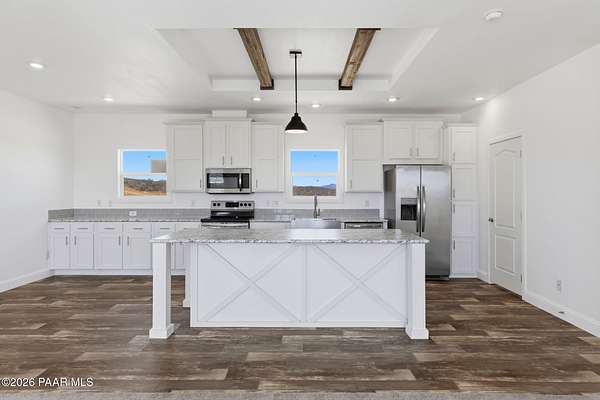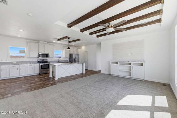 Move-in-ready never-lived-in 2021 manufactured home on 2.15 private acres in Dewey-Humboldt with panoramic mountain views, valley views, desert views, and nearby BLM land. This 3 bedroom, 2 bathroom home with a den features 2,072 sq ft, open-concept living, a split floor plan, large picture windows, decorative ceiling beams, stainless steel appliances, white shaker cabinets, a large kitchen island, pantry, walk-in closet, dual sinks, soaking tub, separate shower, covered deck, RV parking potential, and room for horses or outdoor toys.