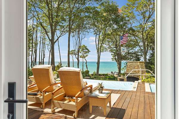 Expansive Lake Michigan estate with 200 feet of private beachfront and nearly 4 acres of rolling woodlands. Stunning lake views frame a property designed for summer enjoyment, featuring multi-level Ironwood decking, a swim spa, Jacuzzi, full outdoor kitchen with al fresco dining, outdoor fireplace, sunset deck, 3 tiered waterfall koi ponds, extensive gardens, a 30' flag pole, and stairs leading to a wide sand beach and swimmable pristine water of Lake Michigan. Entrance includes 200 year old imported French Chateau columns with iron fence and electronic gates. Inside you'll find 7 bedrooms, 7 full baths, and 2 half baths across more than 7,700 finished sq. ft. on three levels. Highlights include primary suites on both the main and upper levels, three indoor fireplaces, a renovated and enlarged chef's kitchen, inlaid hardwood floors on the main level, and elegantly updated baths. Extensive updates include a Slate Roof, Copper Gutters, Swim Spa and Hot Tub Mechanicals, Underdeck Mechanical Room, Two High End Heat Pump Furnaces and Air Conditioners, Front Iron Gate Motors, and more, further elevate this remarkable home. Conveniently located between Saugatuck, Douglas, and Holland, and close to the 1,000-acre Saugatuck Dunes State Park. The newly open floor design offers a panoramic view of Lake Michigan and a great traffic flow, ideal for entertaining. The main level also showcases new oak hardwood floors and a rebuilt staircase that sets the tone for the home's elegant updates. The family room features a new Limestone fireplace surround, custom wood paneling and lighting, while the dining room offers a built-in wet bar. Custom built pantry cabinet. Many of the lakeside windows have been replaced and Pella French doors added allowing natural light to highlight the fully renovated kitchen, which includes a quartzite island and counters, built in Sub-Zero refrigerator and freezer, and a 5-burner, double oven La Cornue range. This expanded kitchen flows seamlessly into the living room with a custom built entertainment system. The primary suite on this level is complete with a gas fireplace, a lakeside sitting room, and a renovated bath featuring quartzite counters, heated floors, a walk-in tiled shower, heated marble tiled flooring, and a walk-in closet. 2 convenient half baths, laundry room, and three-stall heated garage with newly epoxied floors complete the main level. The upper level continues the sense of luxury with a second primary suite offering a fireplace, walk-in with cedar closet, laundry, and a new lakeside Trex deck. The attached bath has been beautifully updated with a soaking tub, walk-in shower with tankless water heater above, and heated marble tiled floors. This floor also provides three additional bedrooms, including a lakeside ensuite, along with a spacious office with balcony, a library with built-in storage, and a full bath. The walkout lower level, with in-floor radiant heat, opens to the outdoors with sliders and includes a large recreation room, exercise area, full bath, and an additional en suite bedroom. A workroom and large storage area provide abundant space for hobbies and organization. Additional items include Four new Fireplace Inserts, Three New Trex Decks, Tankless Hot Water Heater above Primary Shower, Iron Curtain Water Filtration, and Self Watering Flower Pots and Window Boxes. Each of the last two owners have invested over $5 million total in renovations, creating a showcase Lake Michigan estate.