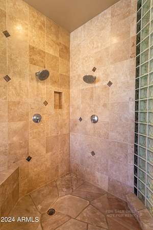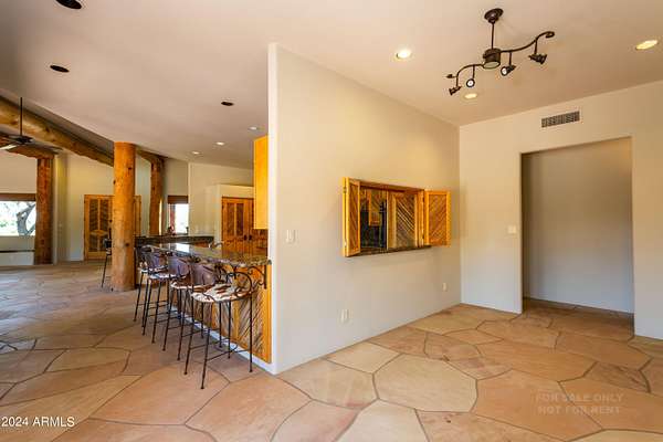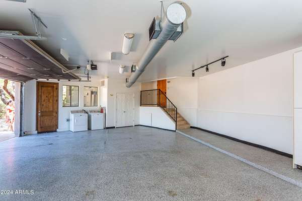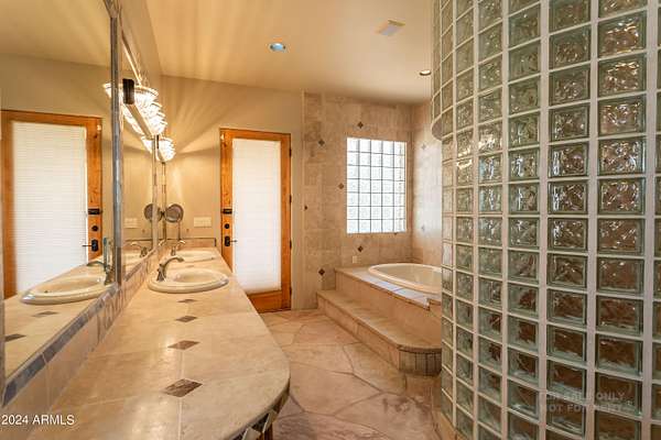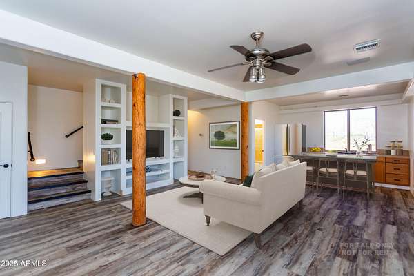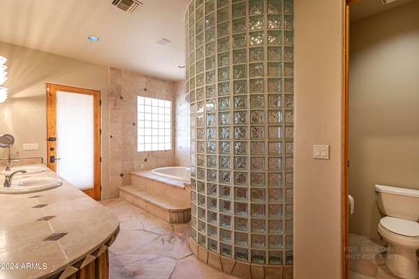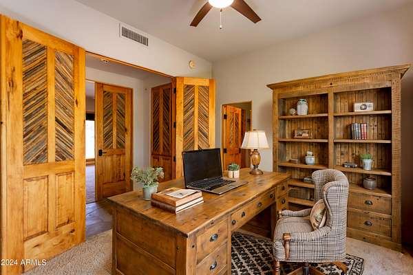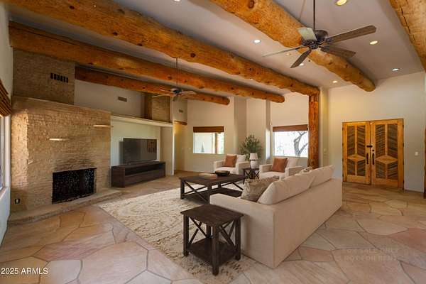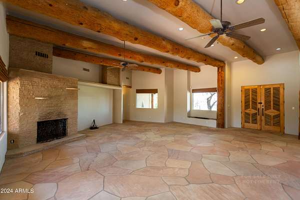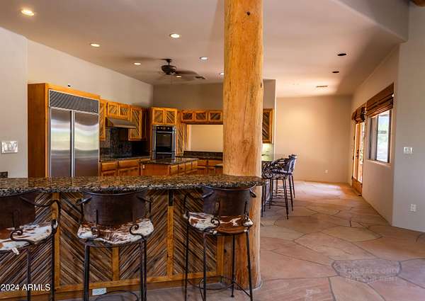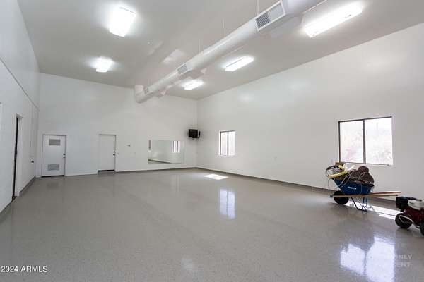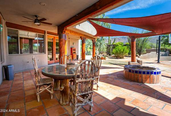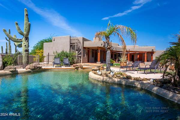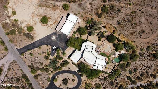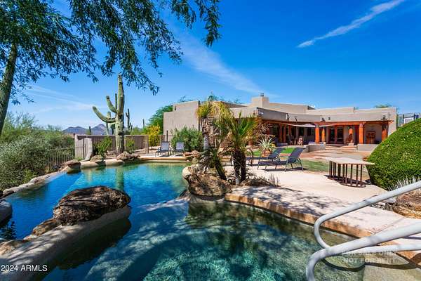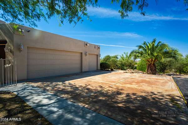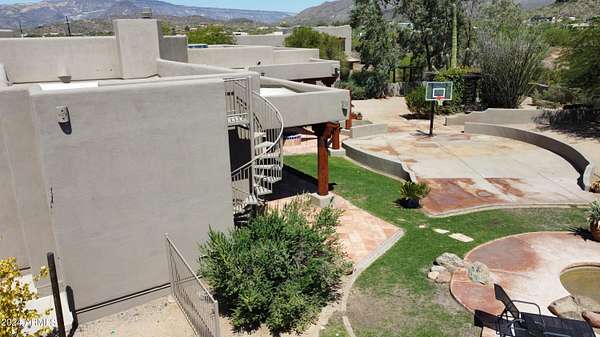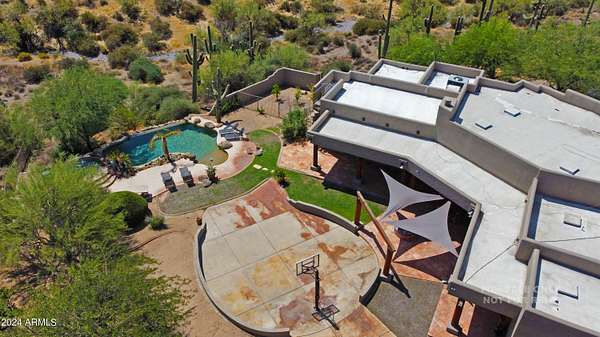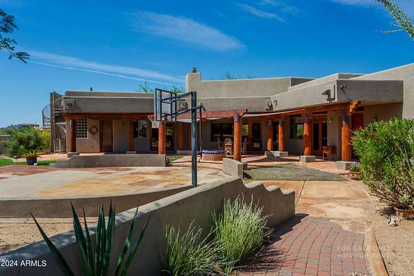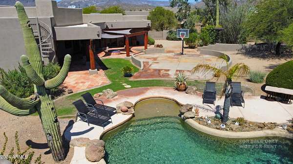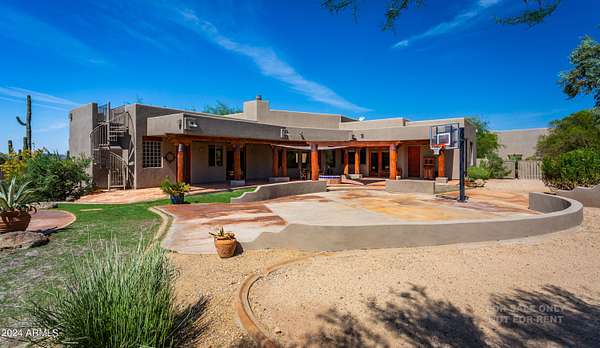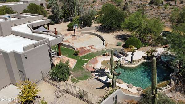 Experience privacy and convenience on this stunning 4.451-acre Cave Creek property, just minutes from Downtown Cave Creek and Spur Cross trails. The main home offers two bedrooms plus a grand owner's suite with a private office and oversized closet. Large windows frame beautiful desert and mountain views. The backyard features an infinity pool, koi pond, basketball court, and two horse stalls, plus a rooftop deck for amazing sunsets. A 1,500 sq ft guest house adds flexible living space, and the RV garage plus 3-car garage provide climate-controlled storage for up to 8 vehicles. Additional acreage available with the right offer.