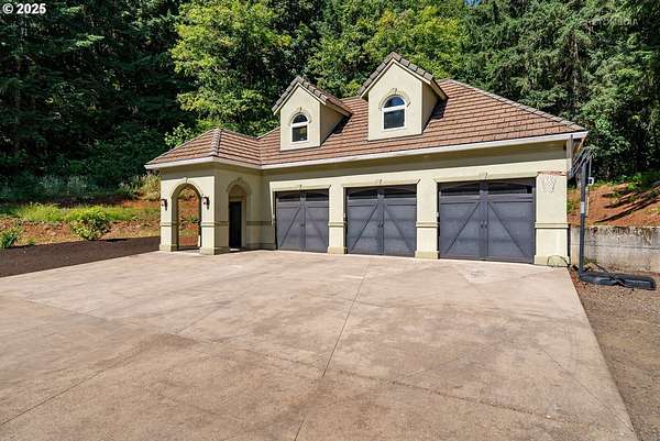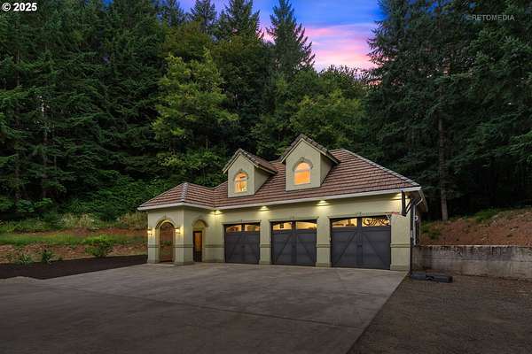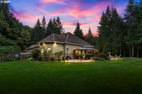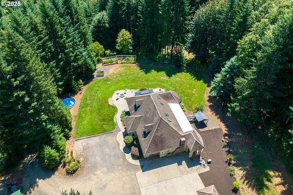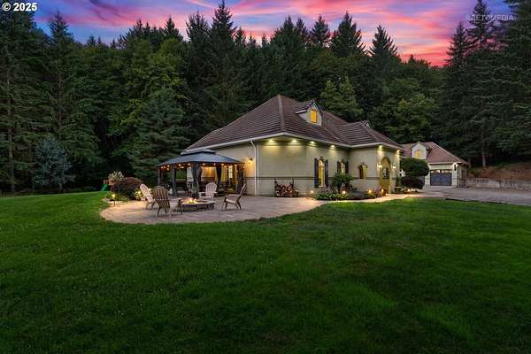 Welcome to 40811 NW Linklater Rd, North Plains, OR - a private Tuscan-inspired retreat set on two forested parcels with Whiskey Creek and Trickle Creek winding through. Enjoy groomed trails for walking, riding, or quads, with room to expand. A timber deferral offers potential marketable timber (buyer to verify).Outdoor amenities include an above-ground pool, full-yard irrigation, a large garden with irrigation, stunning paver patio with firepit, and a covered RV pad with its own patio. In addition, this property offers direct creek access with a designated picnic and camping area, perfect for relaxing or overnight stays immersed in nature.The 5-bed, 4-bath home features radiant and in-floor heating, a high-producing well, septic, and main-level living with two primary suites. Upstairs offers two bedrooms, a shared bath with tiled walk-in shower, and a spacious common area.A detached 3-car garage provides ample storage and includes a bonus room with half bath and separate electric meter-ideal as a workshop, guest suite, or hangout.A rare opportunity to own a peaceful, self-sufficient sanctuary where nature and comfort meet.Note: Two parcels are sold together one being R2092325 which the home sits on at 5.0 acres and the other R2092324 which is 11.11 acres .HOME IS MOVE IN READY.