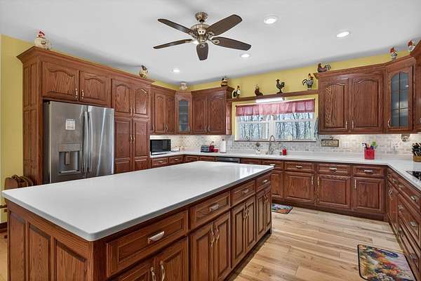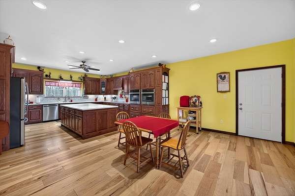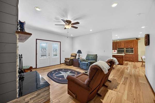 Nestled on 19.19 private acres, this beautifully maintained single-level home offers the perfect blend of comfort, craftsmanship, and country living. Inside, rich hickory flooring flows throughout the main living spaces, complemented by a cozy wood-burning fireplace that creates a warm and inviting atmosphere. The home is equipped with modern infrastructure, including underground fiber-optic utilities and a 200-amp electrical panel, ensuring reliability and high-speed connectivity. Outdoors, the land is a true highlight, featuring established blackberry bushes, grapevines, and peach trees ideal for those who appreciate gardening, homesteading, or simply enjoying nature's bounty. With ample acreage for privacy, recreation, or expansion, this property delivers peaceful living without sacrifi