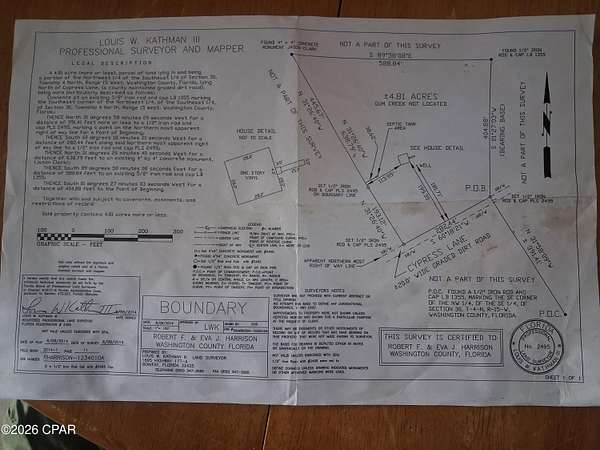 Discover this peaceful 4.81-acre parcel featuring a charming 1-bedroom, 1-bathroom home and the serene flow of Gum Creek running right through the property. This small creek holds water year-round and is perfect for fishing, offering a tranquil water feature and natural beauty right in your backyard. The existing home provides a cozy starting point with a durable metal roof and cooling via window units--ideal for anyone ready to add their personal touch. While it needs some work and TLC to bring it to its full potential, it presents a fantastic opportunity for renovation, a weekend getaway, or building your dream home on this spacious lot. Water is supplied by a shared well connected to the neighboring mobile home, with an old abandoned well also present on the property for potential future use or reference. Included with the sale is a small fixed shed for convenient storage. (Note: Any movable shed does not convey.) Located in a quiet, rural setting, this property is just under an hour's drive from the stunning white sands and vibrant attractions of Panama City Beach, FL--giving you easy access to Gulf Coast beaches, dining, shopping, and entertainment while enjoying the privacy and natural surroundings of country living. Whether you're envisioning a fixer-upper homestead, a recreational escape, or a blank canvas for new construction, this Gum Creek gem offers endless possibilities with its acreage, perennial creek, and prime proximity to the beach. Don't miss this affordable slice of Florida paradise--contact us today to schedule your viewing and start envisioning the lifestyle you've been dreaming of!