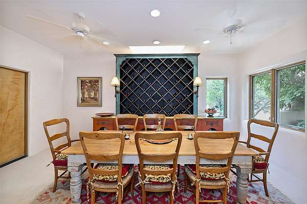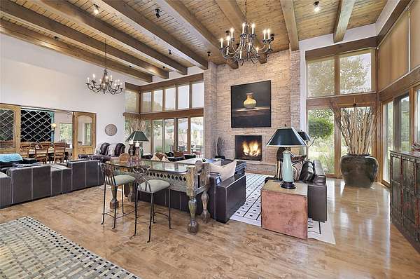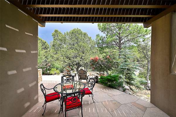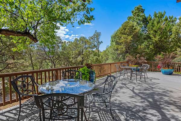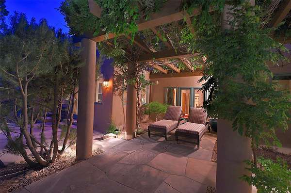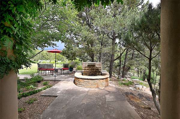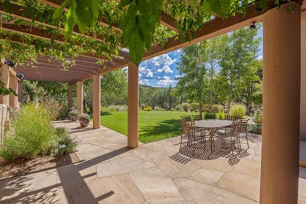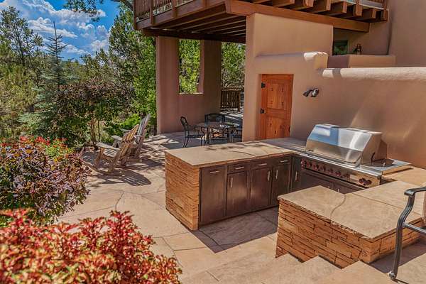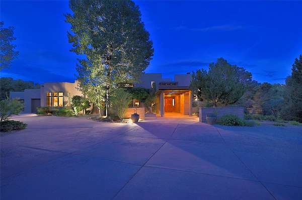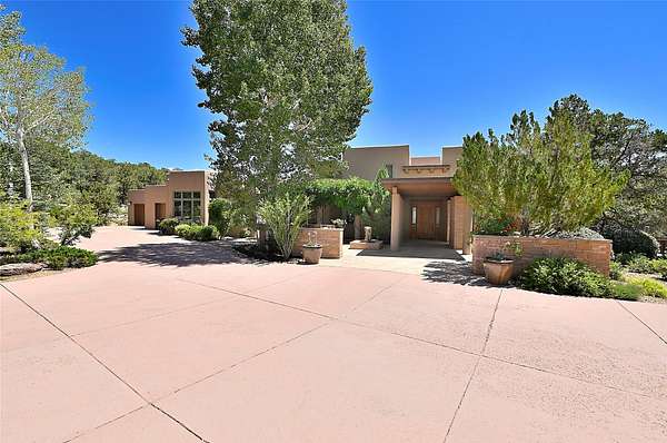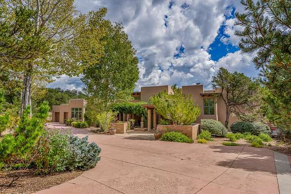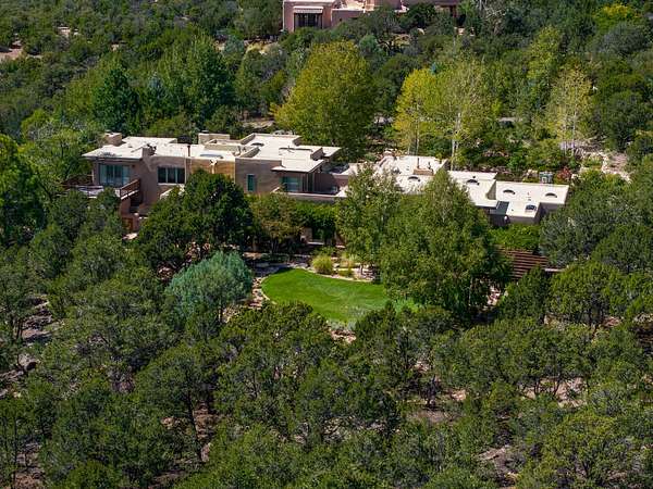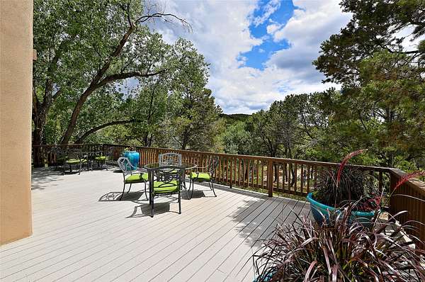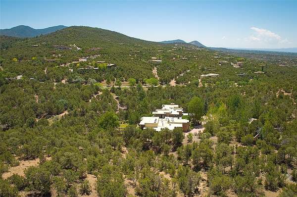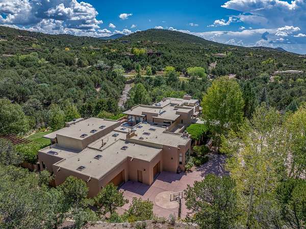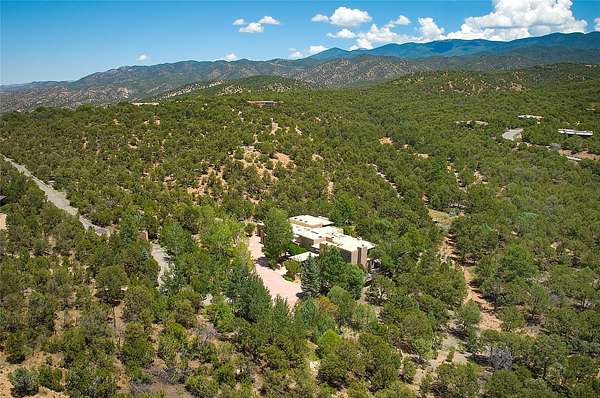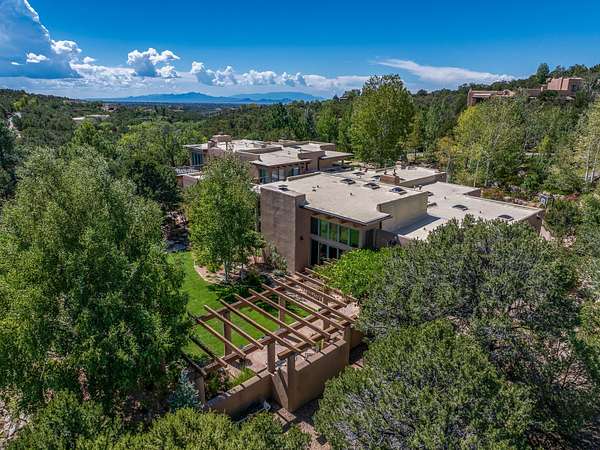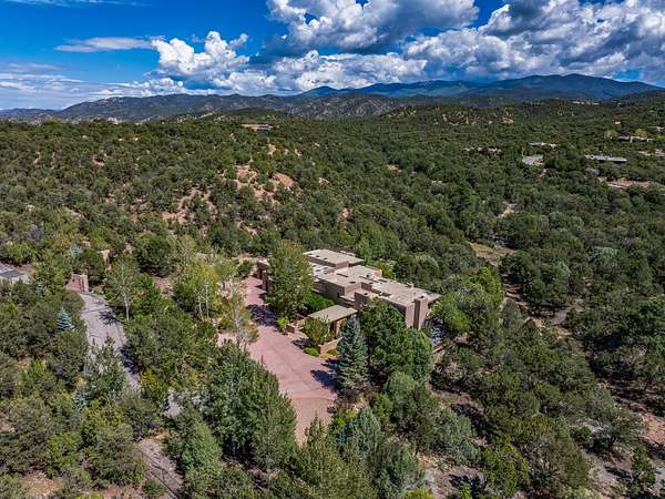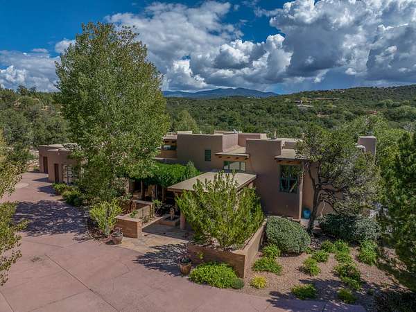 Perched on over 3 lush acres in one of Santa Fe's most coveted enclaves, this exceptional estate offers a rare synthesis of space, serenity, and natural beauty. It is less than 10 minutes from the plaza and the city's extensive mountain hiking trails are only a short walk away. Designed with both privacy and flexibility in mind, the residence unfolds across two thoughtfully connected wings, encompassing five bedrooms and a range of inviting communal and intimate spaces. It is ideally suited for multigenerational living, entertaining, or even a creative retreat. The main level is tailored for effortless single-level living, featuring expansive formal and informal gathering areas, two nicely equipped kitchens, three bedrooms (one of which is a grand suite with a private entrance), a game room and 2 car garage. A sauna and steamroom are situated in the guest bath on the main level. Seamless indoor-outdoor living is made possible through multiple portals, decks, and lawn spaces, framed by towering Aspens, Ponderosa Pines and Pinons, with manicured lawn and gardens, tranquil water features, and sweeping mountain views. Upstairs, two spacious en-suite bedrooms each open to their own private view decks, offering peaceful havens for rest, reading, or quiet contemplation. The home is connected to city utilities, has central air conditioning and heat and has been meticulously maintained, ensuring comfort, durability, and modern ease. Properties of this caliber, combining architectural versatility, natural grace, and premier location, are seldom available. Additional contiguous parcels totaling over 11 acres with commanding hilltop views may be acquired separately, offering a rare opportunity to expand and create an even more secluded private compound.