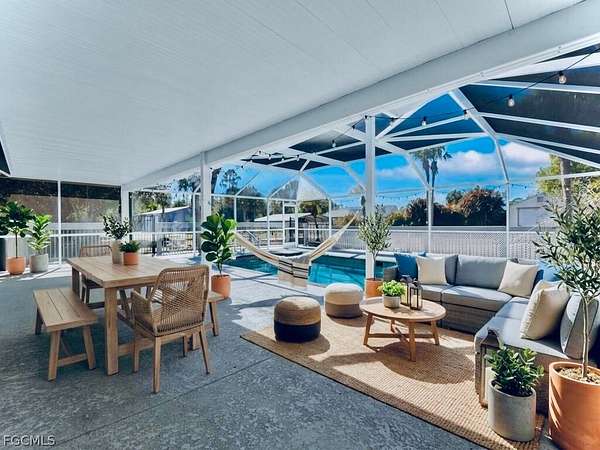 Welcome to this MASSIVE over 2,600 sq ft 4/2.5 + Den POOL 1.5 ACRES TRIPLE LOT home nestled away on a quiet dead end with a 1,500 detached WORKSHOP featuring separate utilities, bathroom, Office, 3 large Roll up doors, and big covered carport! It has been freshly painted and highlights SOLID surface countertops, tile & luxury vinyl flooring throughout, a rewarding great room with cathedral ceilings, newer fixtures, HIGH efficiency washer & dryer, spacious WALK-IN closets, and an awarding recreational room with built-in bar + sink great for entertaining. This Peaceful property is NOT in a flood zone & nicely landscaped with mature oaks & highlights an enormous extended patio with pavers & walkways, multiple detached storage sheds, fenced in kennel area, two horseshoe pits, an extended driveway, HIGH SPEED internet, and a screened & tiled front porch. Excellent work from home opportunity with heavy equipment storage, plenty of room for hosting events or parties, just minutes away to all major amenities, Williams park, and a quick commute to Fort Myers. Schedule your showing today!