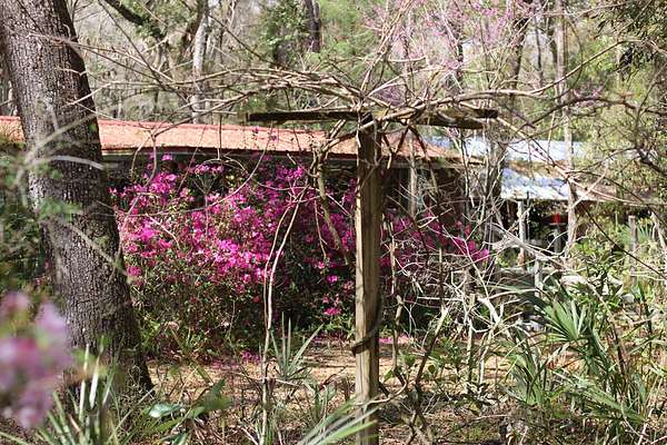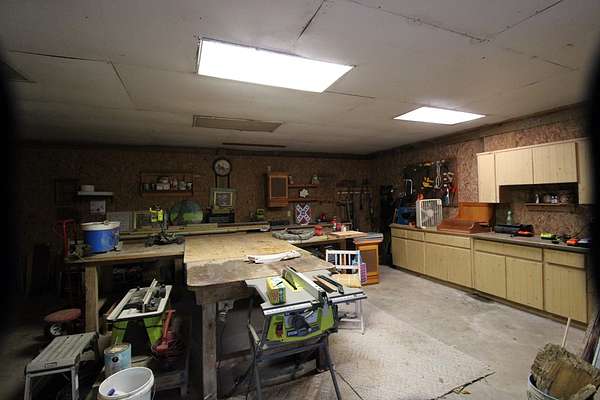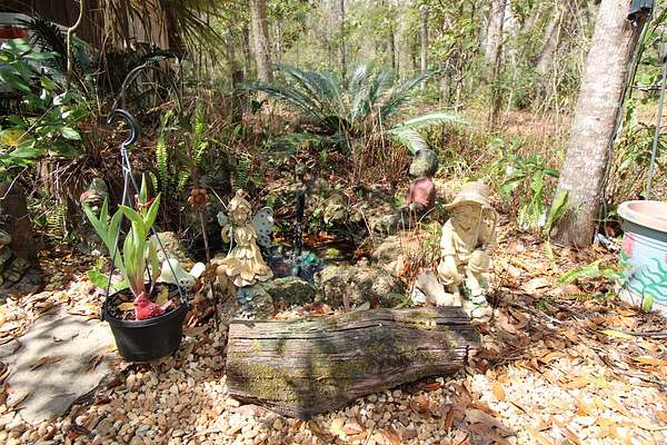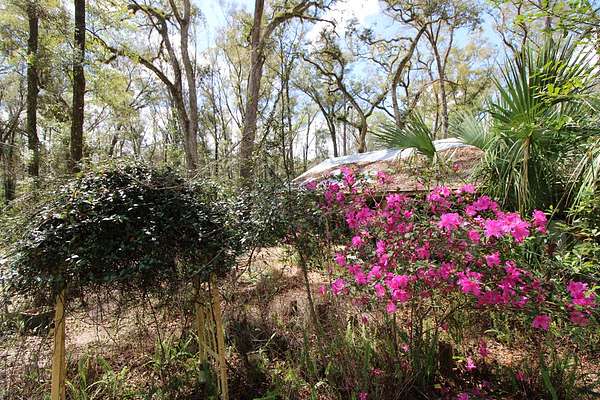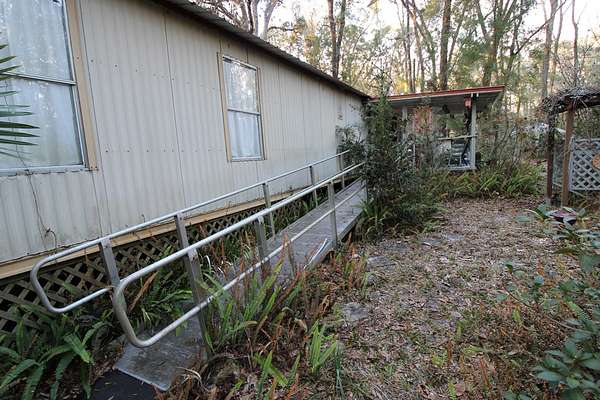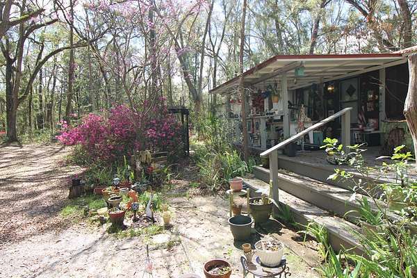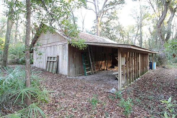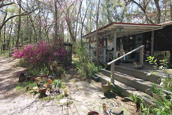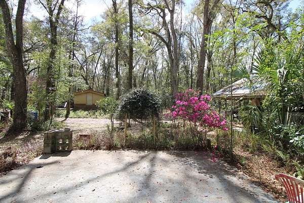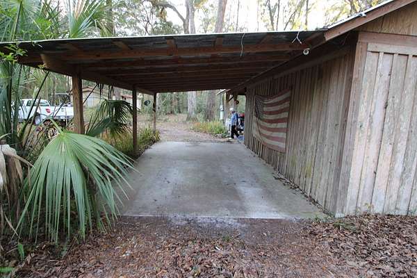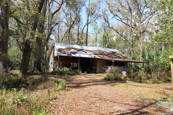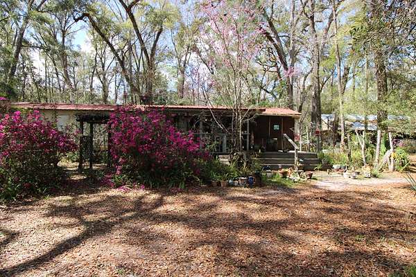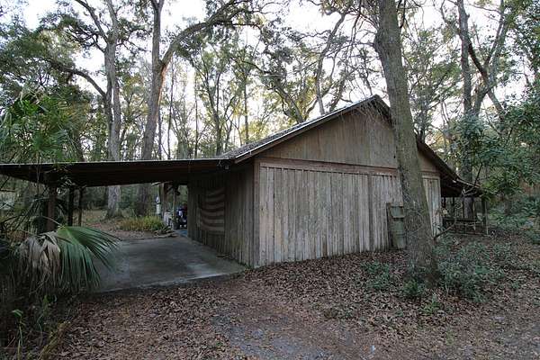 5 acres Barn Office Remodeled Home, Natural Wooded property with amazing trees greet you as you drive in the natural circular driveway on this mini estate. Newer metal roof, newer AC Unit (still under warranty), covered porch, and a metal wheel chair ramp. Completely NEW handicapped shower and bath, with remodel just completed in 2025. HUGE Workshop, complete with cabinets, countertops, and tools. A woodworker's dream! Use as a Man Cave, She Shed, and even has a separate Art Studio/Office. Covered parking for cars and boats, tractors, etc. Concrete Slab can be for possible RV parking (check with county), or courtyard, or grilling area. Outdoor fountain and pond, Too many features to mention! Well has newer filtration system! Come see this one today, it won't last long. So. Much. Potential! Close to Suwannee River, Springs, Gulf of Mexico. Experience true nature here!