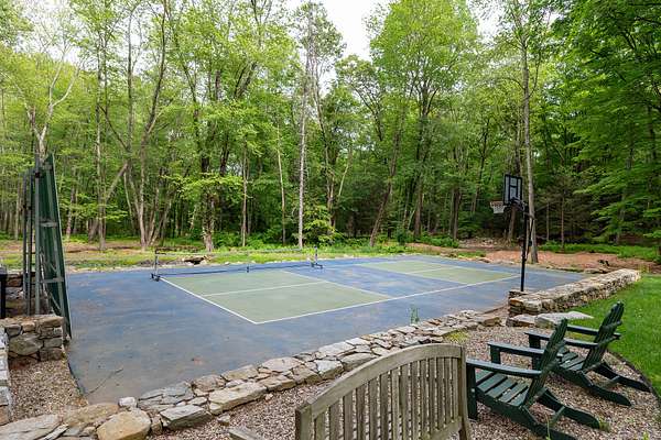 Est $19,666/moDiscreet Gates Lead to Totally Private 30+ Acre Waterfront Compound. Totally Renovated 3 Bedroom, 2.5 Bath House with Heated Pool & Lake Views. A Large Modern Kitchen with Vaulted Ceiling; Great Room with Fireplace. Impressive Main Level Primary Suite with Full Bath, Office & Sitting Room. 2 Separate Fully Equipped Guest Cottages are Set Arm's Distance from the Main House. New Sports Court. Separate 4-Car Garage. A Private Path Leads to Wonderful Lake Area with New Dock & Total Serenity.