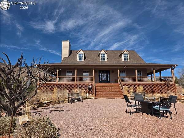 The "ROYAL RANCH" is like no other...tucked away in the mountains with a private gated driveway and unprecidented EXPANSIVE 360 VIEWS that will leave you speechless, yet only 10 short miles from Canon City for all your shopping needs. From the beautiful redwood wrap around deck take in the VIEWS of the snow covered 14000 ft Sangre De Cristos and the many colorful vistas of various mountains and foothills then turn your gaze towards the world renowned ROYAL GORGE BRIDGE, one of the highest suspension bridges on the planet spanning the mighty Arkansas River teaming with varieties of fish and other wildlife. The river also boasts rapids that will make most river rafters gasp during the early spring runoff. The home sits upon a knoll that is bordered by miles and miles of government lands ie BLM teaming with all sorts of wild game and endless hiking and horseback riding. This immaculate home greets you with a gorgeous redwood wrap around deck. Enter into the Massive Living Room with a stacked rock gas fireplace to keep you toasty on those cool Colorado evenings and venture into the gourmet kitchen with stunning hardwood flooring and write bright kitchen cabinetry, top of the line stainless appliances and stunning warm and inviting granite counters. The MAIN level MASTER off the living room has a 5 piece ensuite, soaking tub and oversize shower and walk in closet. Head up stairs to 3 more bedrooms with a huge bath in the hall. Just past the kitchen is the laundryroom and a half bath. From the dining room you may head outdoors to a patio with pavers and a deluxe hot tub that stays with the property. The attached garage ie party room is finished and heated with white cabinets and textured flooring. Great as a conference room, game room, party room or just a fancy garage. A detached shop/garage is an added convenience for the RV, side by side or 4 wheeler. Come be amazed by this setting. Has been used as a successful 'High End' VRBO and wedding venue.