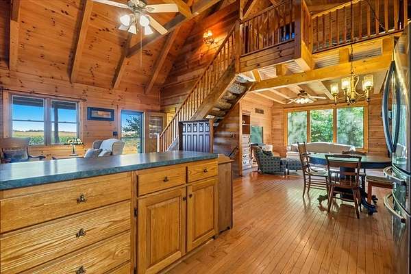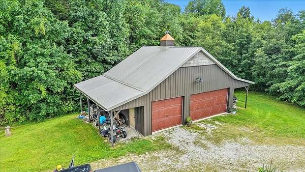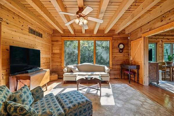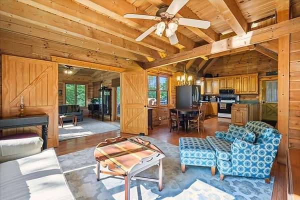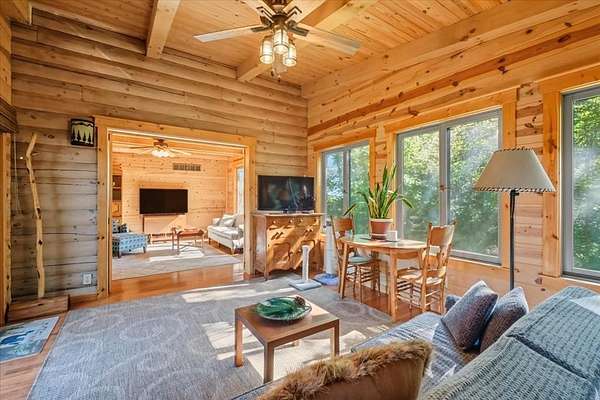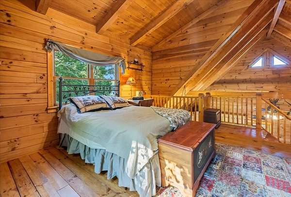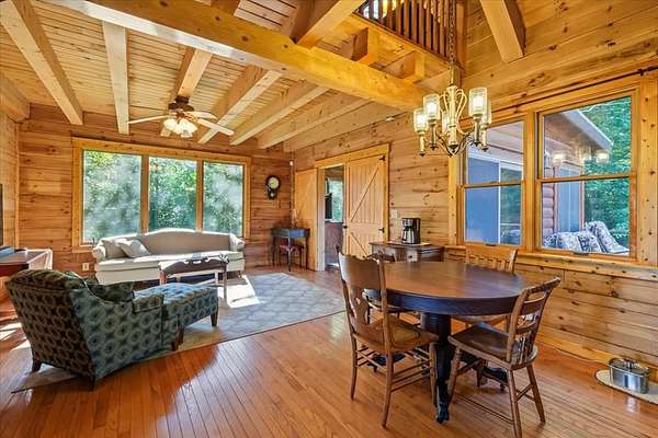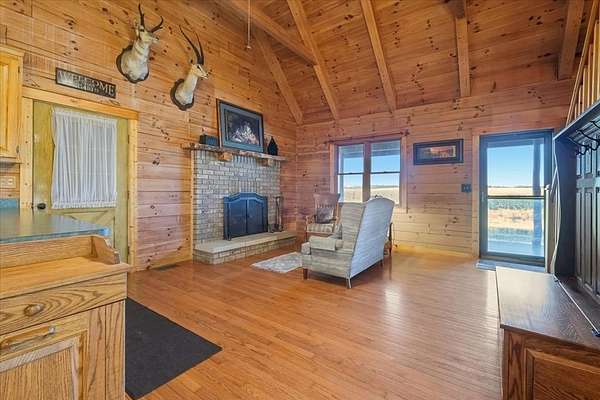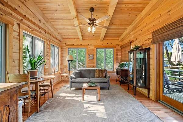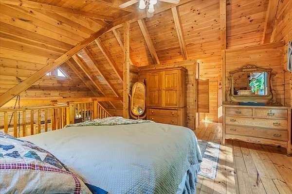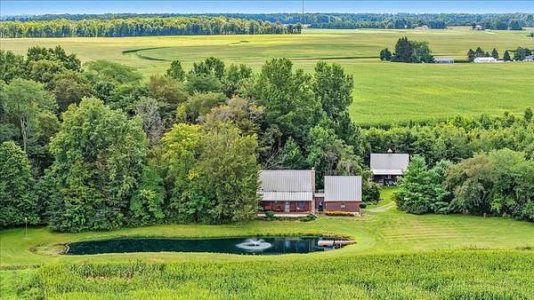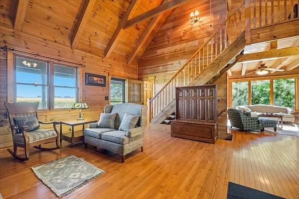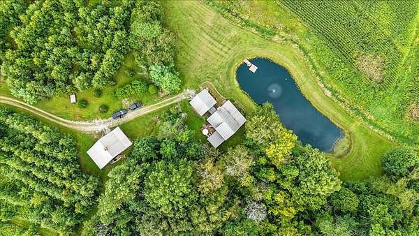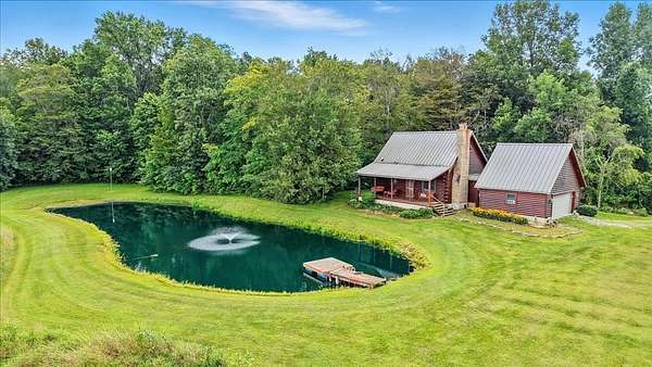 Surrounded by 17.478 acres of woods, water, and open land, this 2001 log cabin feels like a place set apart. A quiet pond reflects the sky, while stands of mature trees and rolling ground frame the setting in every direction. Inside, natural wood and vaulted ceilings create an airy yet warm living space. A loft bedroom overlooks the great room, with two full baths and a lower-level rec room extending the home's versatility. Comfort comes easy with flexible heating options, including forced-air wood burner, forced-air electric, and forced-air propane systems. A 2-car attached garage pairs with a pole barn offering three additional bays, blending rustic character with practical function. With its mix of land, water, and timeless cabin style, this property carries a rare sense of retreat--a place where the landscape and the home feel seamlessly connected.