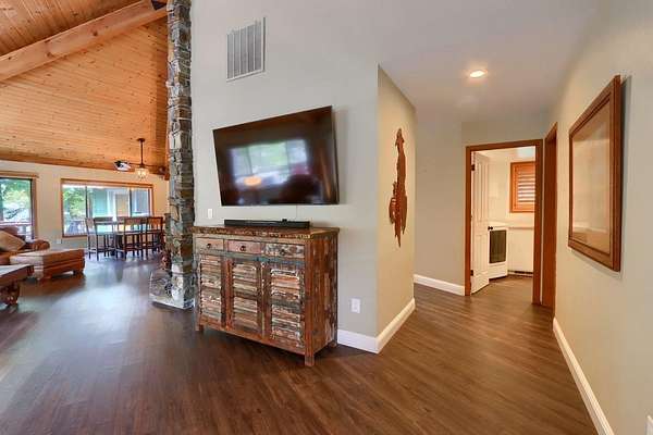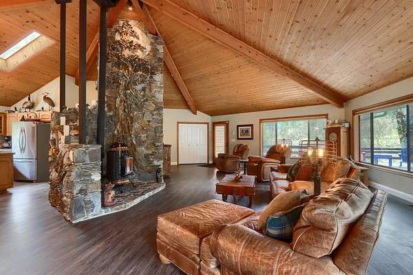 Nestled on over 10 private acres in Ahwahnee, this stunning custom-built 3-bedroom, 2-bath, 2,600 sq ft home offers a rare blend of natural beauty,, privacy, and comfort. Perfectly positioned at the end of a quiet cul-de-sac, the property is bordered by the scenic Fresno River on one side and the peaceful River Creek Golf Course on the other. The grounds are beautifully manicured, featuring mature trees, stricking rock outcroppings, and even your own private beach area along the river--creating a truly serene tretreat. A detached shop and RV parking with full hook-ups add both conveneince and versatility. Inside, the home showcases warm, rustic elegance with tongue-and-groove beamed ceilings and a stunning custom rock hearth as a focal point. The spacious kitchen is designed for both function and gathering, featuring a large center island and counter seating area. Step outside onto the expansive deck, complete with a relaxing spa, where you can take in breathtaking views of the river and surrounding mountain range. Ideally located just under 10 minutes from shopping and amenities in Oakhurst, this home also offers easy access to outdoor recreation--only 20 minutes to Bass Lake and approximately 40 minutes to the entrance of Yosemite National Park. This is more than a home--it's a private mountain sanctuary where nature, comfort, and convenience come together.